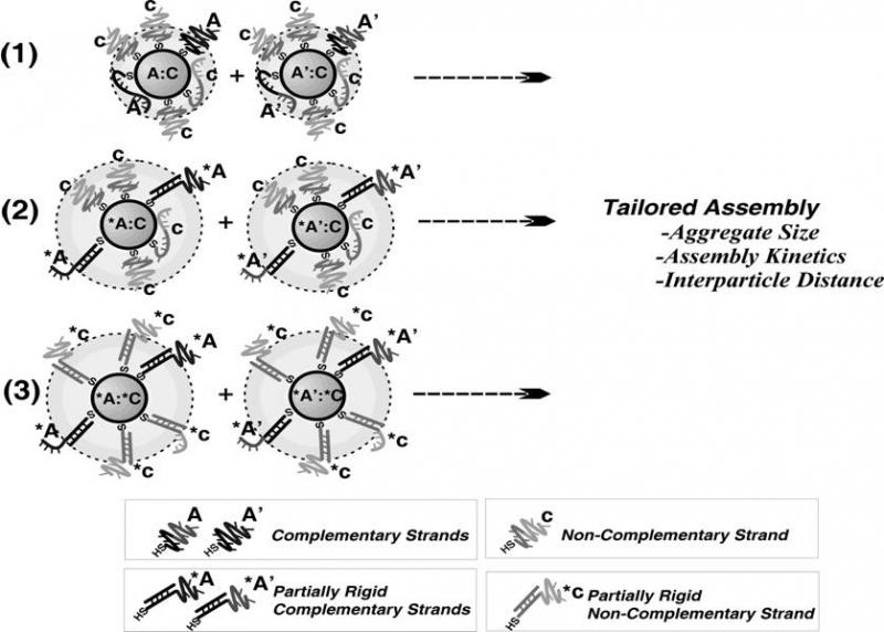 Two types of DNA with different functions are attached to particles' surfaces. The first type - complementary single strands of DNA - forms a double helix. The second type is non-complementary, neutral DNA, which provides a repulsive force.