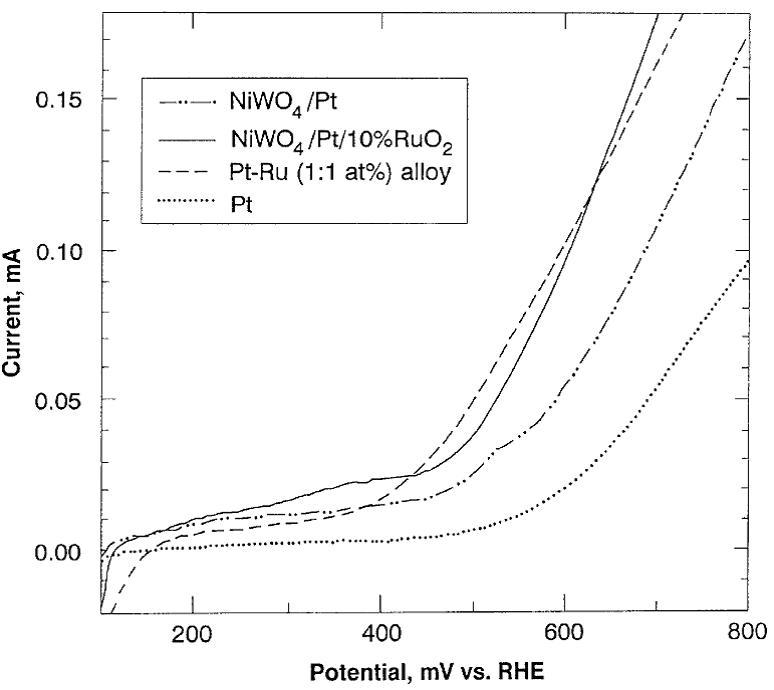 Platinum is an excellent catalyst and electrocatalyst. It is also expensive and vulnerable to poisoning by carbon monoxide in the reaction environment. By supporting platinum on nickel or cobalt tungstate, the amount of platinum necessary to achieve the same catalytic activity for oxidizing alcohol in a fuel cell is reduced, as is the tendency for the platinum to lose its activity during contact with carbon monoxide. Adding about ten percent ruthenium or molybdenum oxide to the binary catalysts improved the performance even more. The higher tolerance for carbon monoxide may also be exploited in fuel cells that use gaseous fuels, such as less-pure hydrogen.