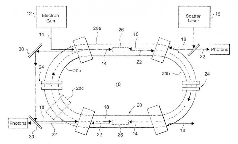 A schematic representation of a photon generator including a high energy electron gun, a high energy laser, and an evacuated interaction track where the relativistic electron beam and the laser beam repetitively collide and responsively emit a high energy photon beam. The resulting high brightness photon beam can be tuned to gamma ray, X-ray, ultraviolet, visible light, or other narrow band EM radiation.