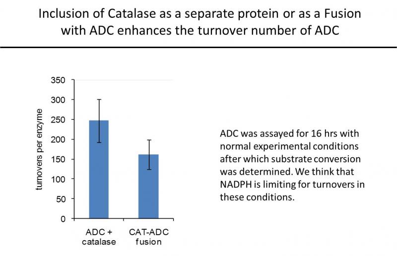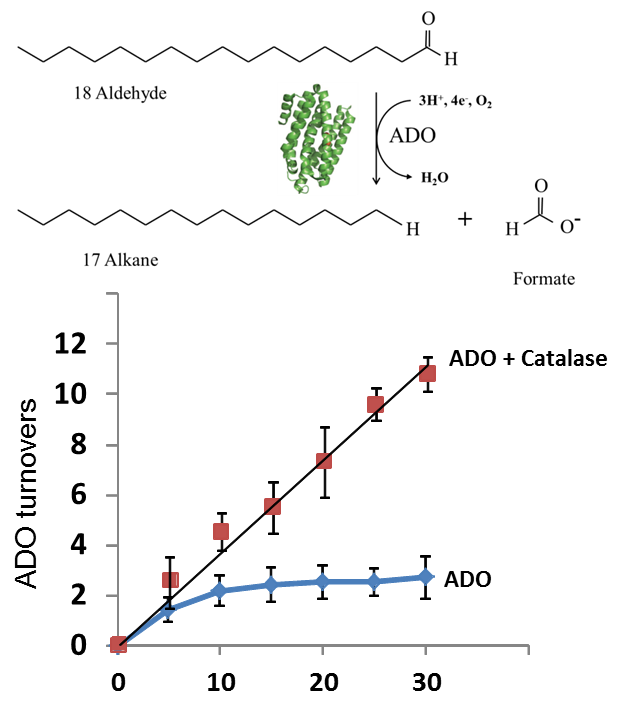 This invention resolves heretofore unrecognized inhibition of aldehyde decarbonylase. The inhibition has been found to result from the byproduct, hydrogen peroxide, that is formed during the reduction of aldehydes to alkanes and alkenes. Two solutions to this inhibition have been found in this invention. In vitro, the aldehyde decarbonylase (ADC) reaction is extended by the addition of catalase to the reaction mixture. Constructs of a fusion between the ADC and catalase produce a fusion protein that in vivo and in vitro efficiently convert aldehydes to alkanes. Thus, not only is inhibition reversed, but the inhibiting byproduct is converted to a substrate!
