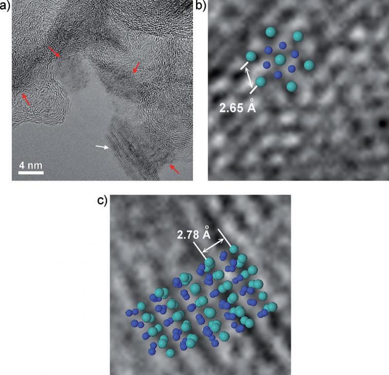 a) TEM image of the stacked MoN nanosheets on carbon supports. The read and white arrows mark the nanosheets that lay flat and stand vertically, respectively. b) A HRTEM image with the crystal structure overlaid looking down along the <002> zone axis, and c) a HRTEM image showing the standing {002} lattice planes (cyan balls:Mo and small blue balls:N).
