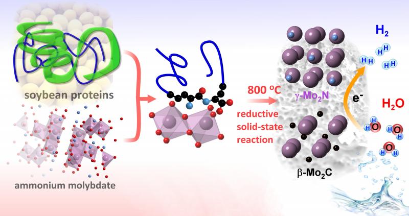 Non-noble metal nitride and carbide nanosheets had been shown to act as effective, low cost alternatives to precious metal, platinum catalysts for electrolysis. These earth-abundant metal nitride and carbide nanosheets have been made more cost-effective by using biomass substitutes for the nitride and carbide materials. It has been found that calcining transition metal salts with protein-rich powdered biomass derived from seeds and nuts produces effective hydrogen-evolution catalysts. The material can be layered onto graphene or other materials to create stable electrodes for electrolyzers. The effective ratio of transition metal salt to biomass can be adjusted depending upon the source of the biomass. Powdered soybean meal and ammonium molybdate heated in a solid-state reaction form compositions of Mo-Nitride and Mo-carbide as the electrocatalytic material.