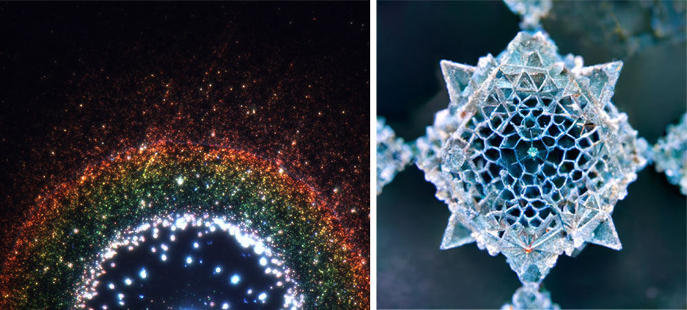 Right: Second Place (Scientific and Technical): This image is not real! It was generated by artificial intelligence (AI) tasked with dreaming about nanomaterials. This image was not generated using CFN equipment. It was generated entirely by computer. - Kevin Yager, CFN Staff, Brookhaven National Lab