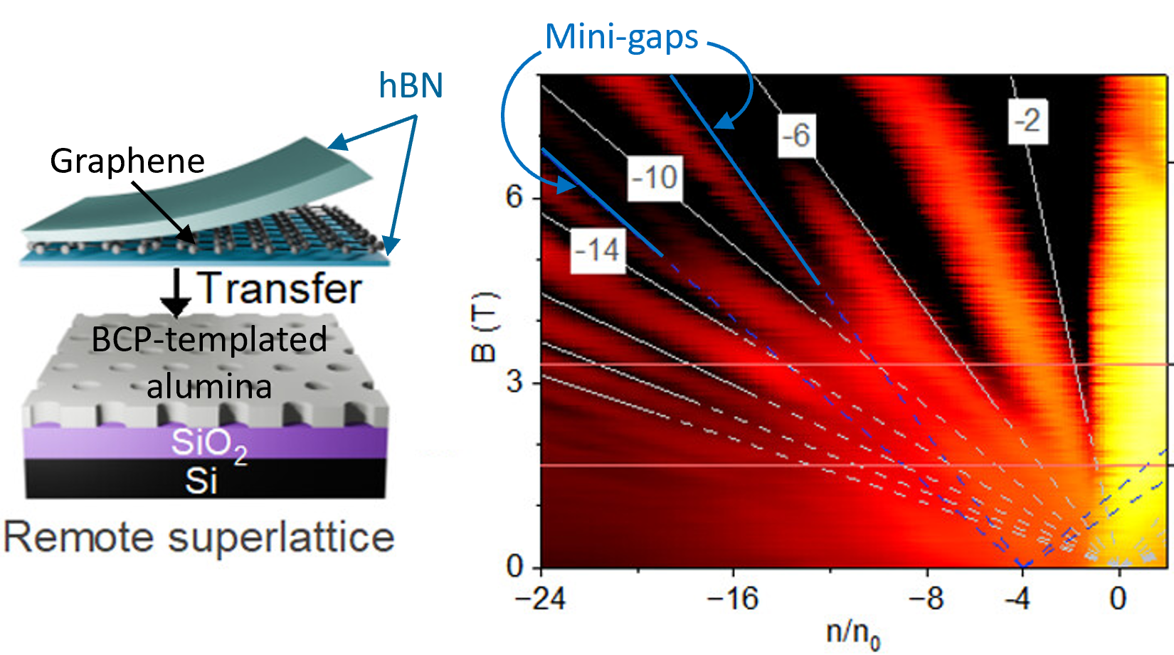 - Despite the rotational disorder, graphene transport measurements showed clear replica Dirac points and Hofstadter mini-gaps, both hallmarks of periodic SL potentials, induced by the nanopatterns.