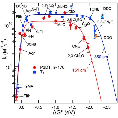 Rate constants for bimolecular electron transfer (ET) increased with driving force, −ΔG°, reached a plateau, and then decreased in an inverted region. This rate data was described well by electron transfer theory subject to a diffusion-controlled limit. These were for ET from radical anions of polydecylthiophene (P3DT) to a series of acceptors in THF solution. When the donor was the smaller anion of quaterthiophene (T4•-) the inverted region was much less prominent and still less so for when the donor was the anion of bithiophene (T2•-). Description of the data using ET theory identifies smaller electronic couplings for the highly delocalized P3DT anions as enabling the inverted behavior: The presence of a Marcus inverted region is a consequence of delocalized electronic states. The results further imply that electronic couplings smaller than usually found for molecules in contact could boost efficiency of energy storage by electron transfer and identifies size-mismatch as an important concept in control of electronic couplings.