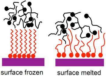 The temperature range over which this frozen monolayer exists is about 10 times greater than what’s observed at the liquid-vapor interfaces of similar materials. According to Alexei Tkachenko, a theoretical physicist who works at Brookhaven’s Center for Functional Nanomaterials, “The temperature range of the surface-frozen layer and its temperature-dependent thickness can be described by a very simple model that we developed. What is remarkable is that the surface layer does not freeze abruptly as in the case of ice, or any other crystal. Rather, a smooth transition occurs over a temperature range of several degrees.”