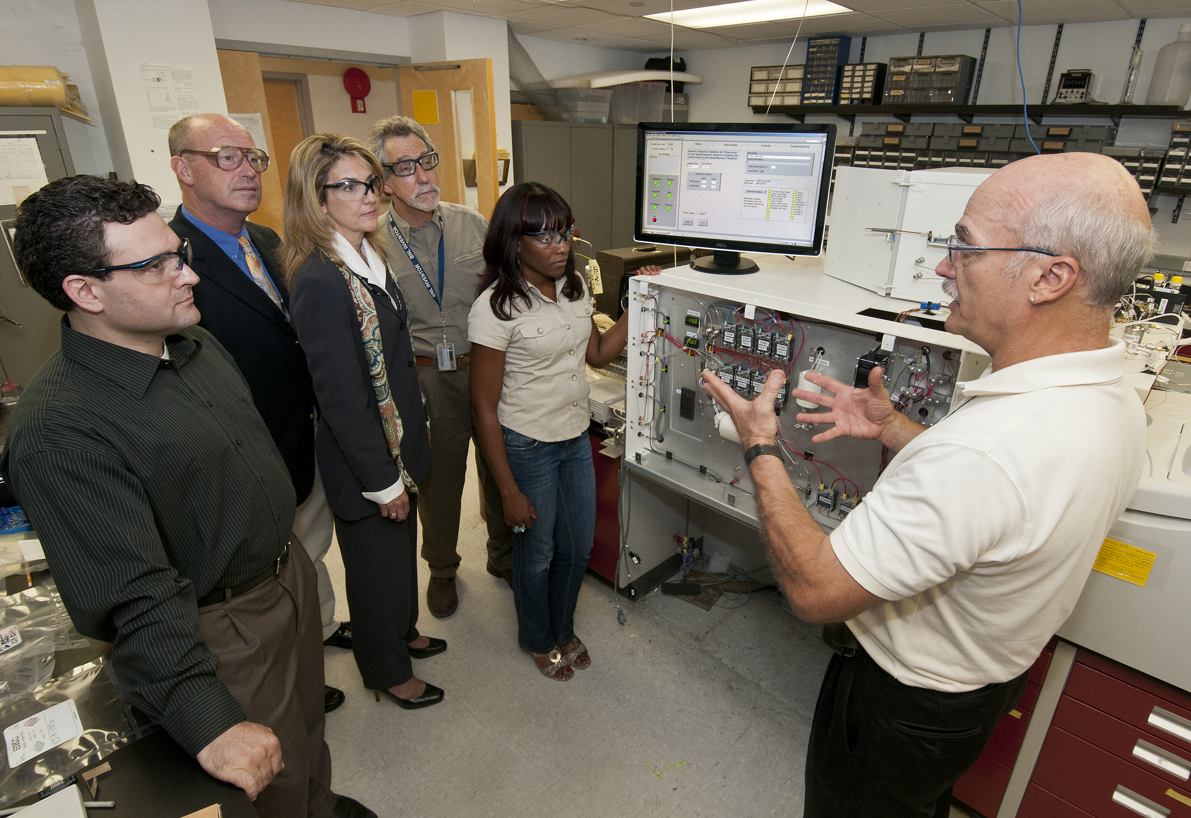 Brookhaven Lab’s Thomas Watson demonstrates perfluorocarbon tracer technology to (second and third from left) Meadowbrook Partners’ Jim and Janet Godfrey, along with (from left) the Laboratory’s Steven Wood, Paul Kalb, and Michelle Cooper.