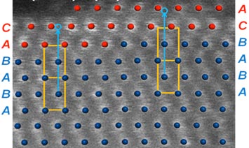 Computational model optimized with Density Functional Theory superimposed over a high-resolution scanning transmission electron microscopy (STEM) image (white dots). Ruthenium retains its structure with ABAB stacking sequence (blue dots) in the core, and the platinum shell switches to the distinct ABCABC stacking sequence.