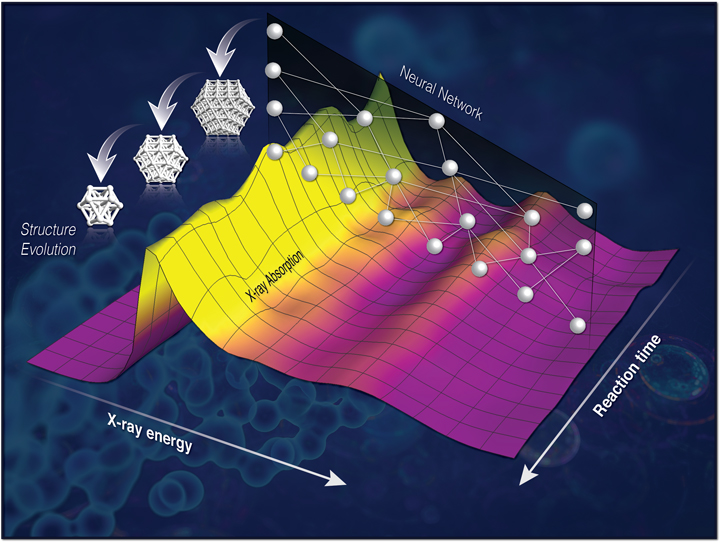 A sketch of the new method that enables fast, "on-the-fly" determination of three-dimensional structure of nanocatalysts. The neural network converts the x-ray absorption spectra into geometric information (such as nanoparticle sizes and shapes) and the structural models are obtained for each spectrum.