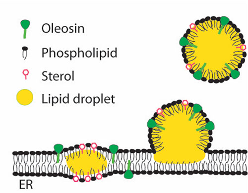 Oil droplet formation Oil (yellow) accumulates between the layers of the membrane that forms the endoplasmic reticulum (ER)—a network of membranes within the cytoplasm of plant cells. Droplets grow and eventually pinch off to become suspended in the cytoplasm. But this process only happens in certain microdomains that are rich in sterols and oleosins along the membrane. The Brookhaven team hypothesizes that sterol is essential to the formation of these droplet-forming microdomains.