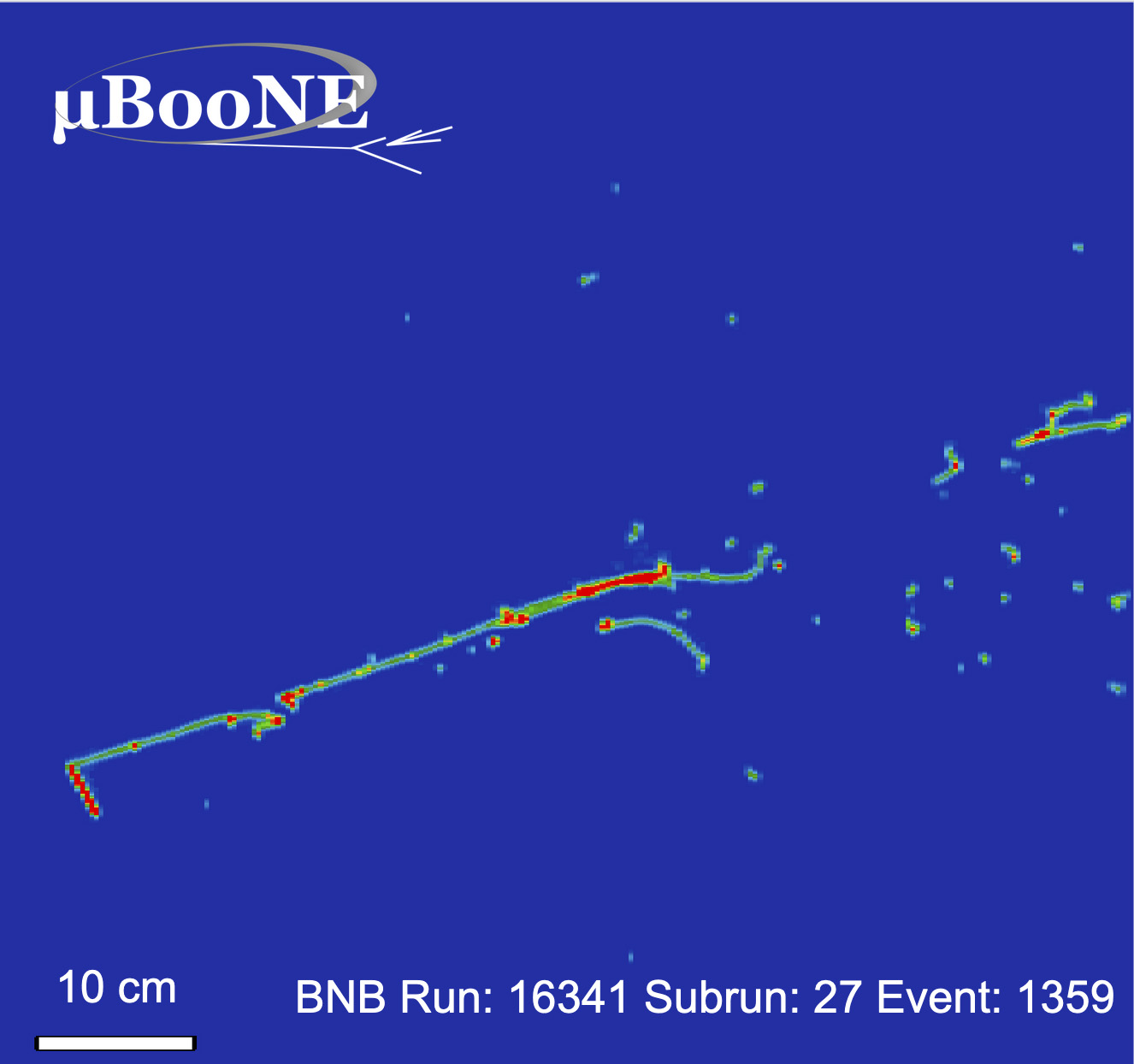 MicroBooNE's advanced liquid argon technology enables researchers to capture detailed images of particle tracks. This electron neutrino event shows an electron shower and a proton track. Image: MicroBooNE collaboration.
