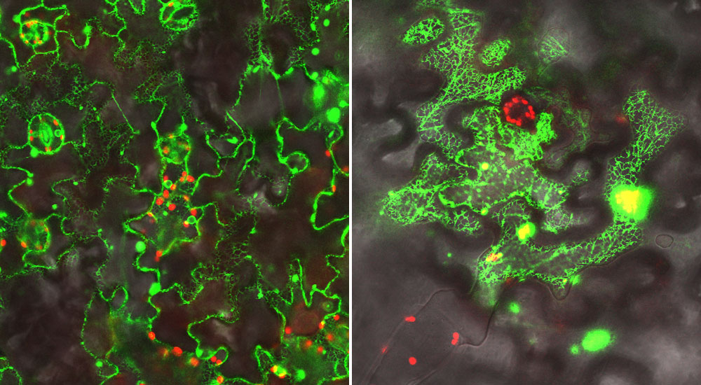 In addition to performing genetic and biochemical studies, the scientists used a green fluorescent protein (GFP) "tag" and microscope facilities at Brookhaven Lab's Center for Functional Nanomaterials to visualize the proteins they were studying in leaf cells. Left: Localization of a GFP-labeled electron donor protein along the endoplasmic reticulum (inner network of membranes) in leaf cells. Right: A GFP-labeled complex of the P450 enzyme interacting with the electron donor. In this case the scientists attached half of the GFP tag to each of these proteins; the fluorescent glow occurs only when the two halves come together as the proteins interact. (In both images the red signal comes from chlorophyl.)