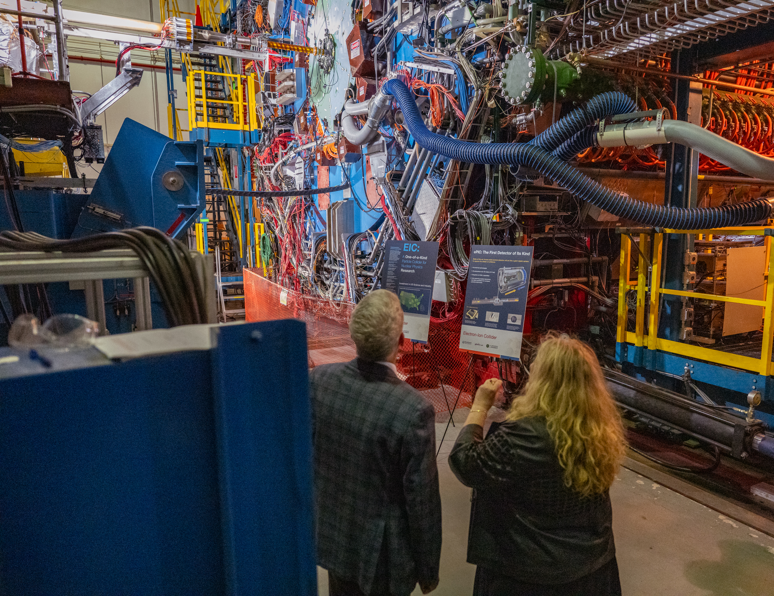 Inside the 2.4-mile-circumference tunnel, Wright followed the path of near-light-speed nuclear particles and viewed RHIC’s house-sized STAR detector, which scientists use to capture glimpses of collisions that recreate the matter that filled the early universe and explore the origins of proton spin. He learned how Brookhaven scientists and partners from across the DOE complex will soon begin work to add an electron ring and other new state-of-the-art accelerator and detector technologies to transform this groundbreaking facility into America’s next collider. At the EIC, speeding spin-aligned electrons will collide with polarized protons and nuclei to open a new frontier in nuclear physics, unlocking the secrets of the building blocks of everything we see in the universe today and the strongest force in nature.