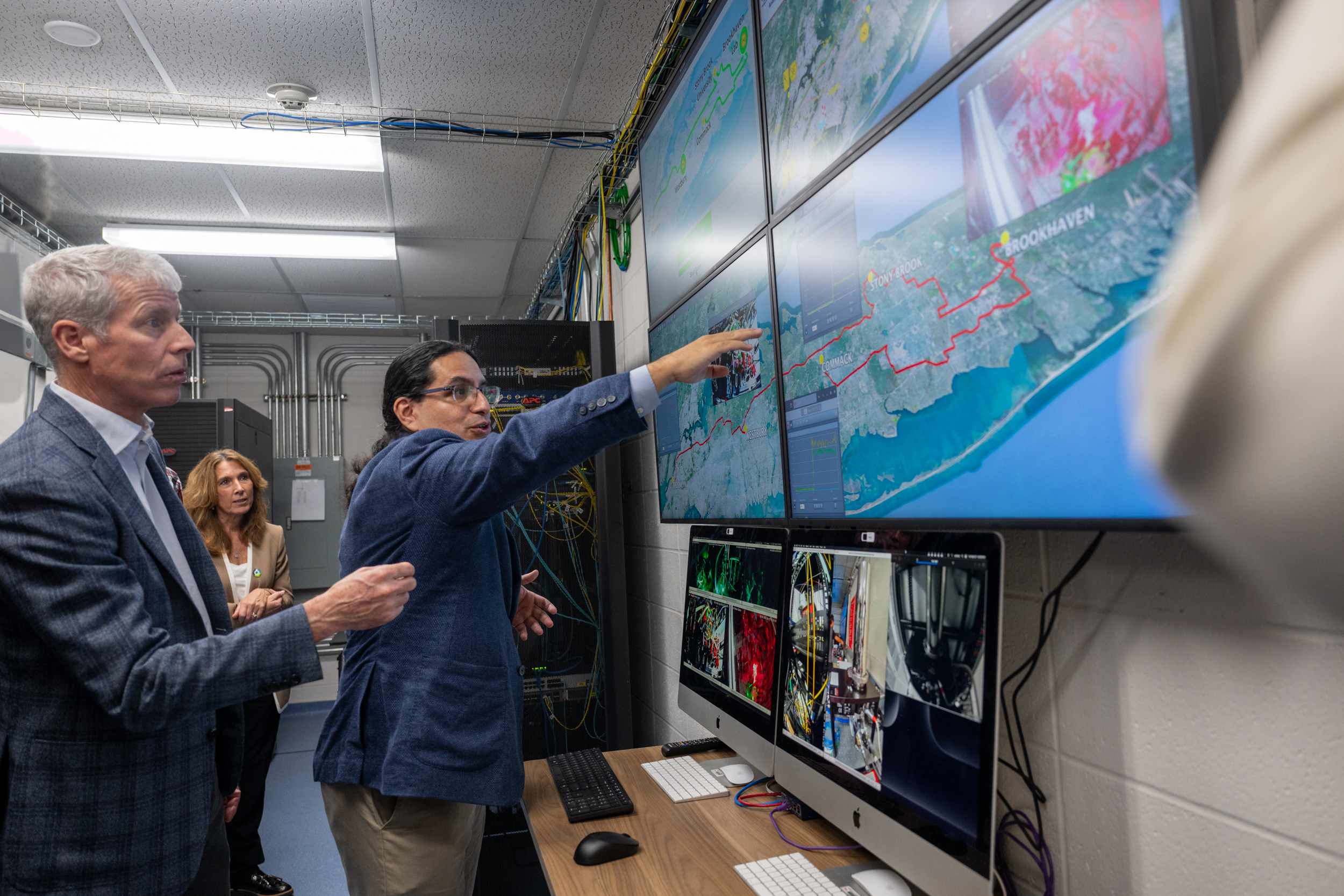 U.S. Secretary of Energy Chris Wright (left), Brookhaven Lab Deputy Director for Operations Ann Emrick, and quantum scientist Eden Figueroa track light particles traveling along the nation's longest fiber-optic quantum network. (Kevin Coughlin/Brookhaven National Laboratory)