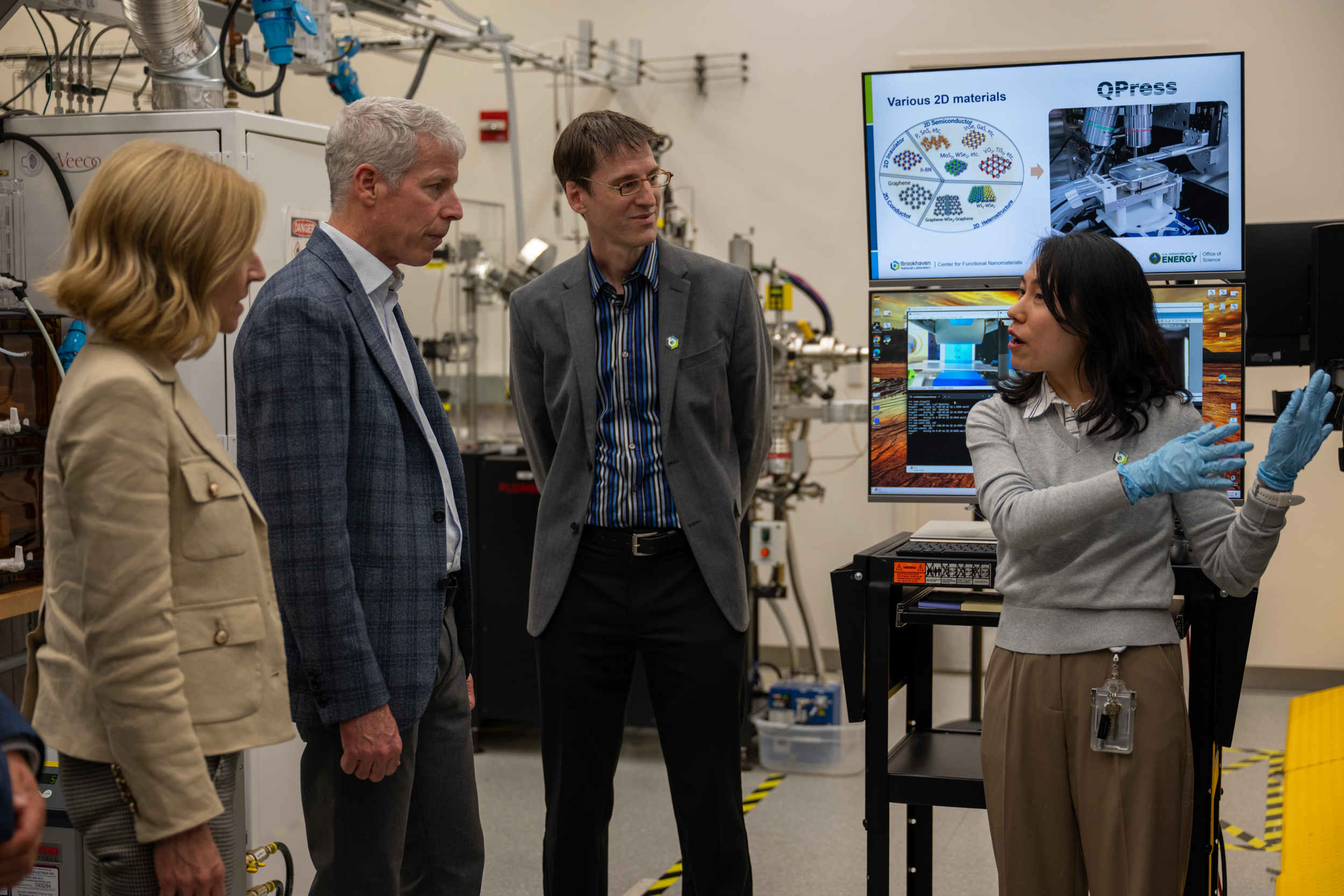 The Secretary then toured facilities in Brookhaven Lab’s Center for Functional Nanomaterials (CFN) that are used to make and characterize materials for applications ranging from advanced electronics to quantum information science. This included a stop at CFN’s world-leading Quantum Material Press, where scientists produce and layer atomically thin materials with desired properties to enable the quantum technologies of tomorrow.