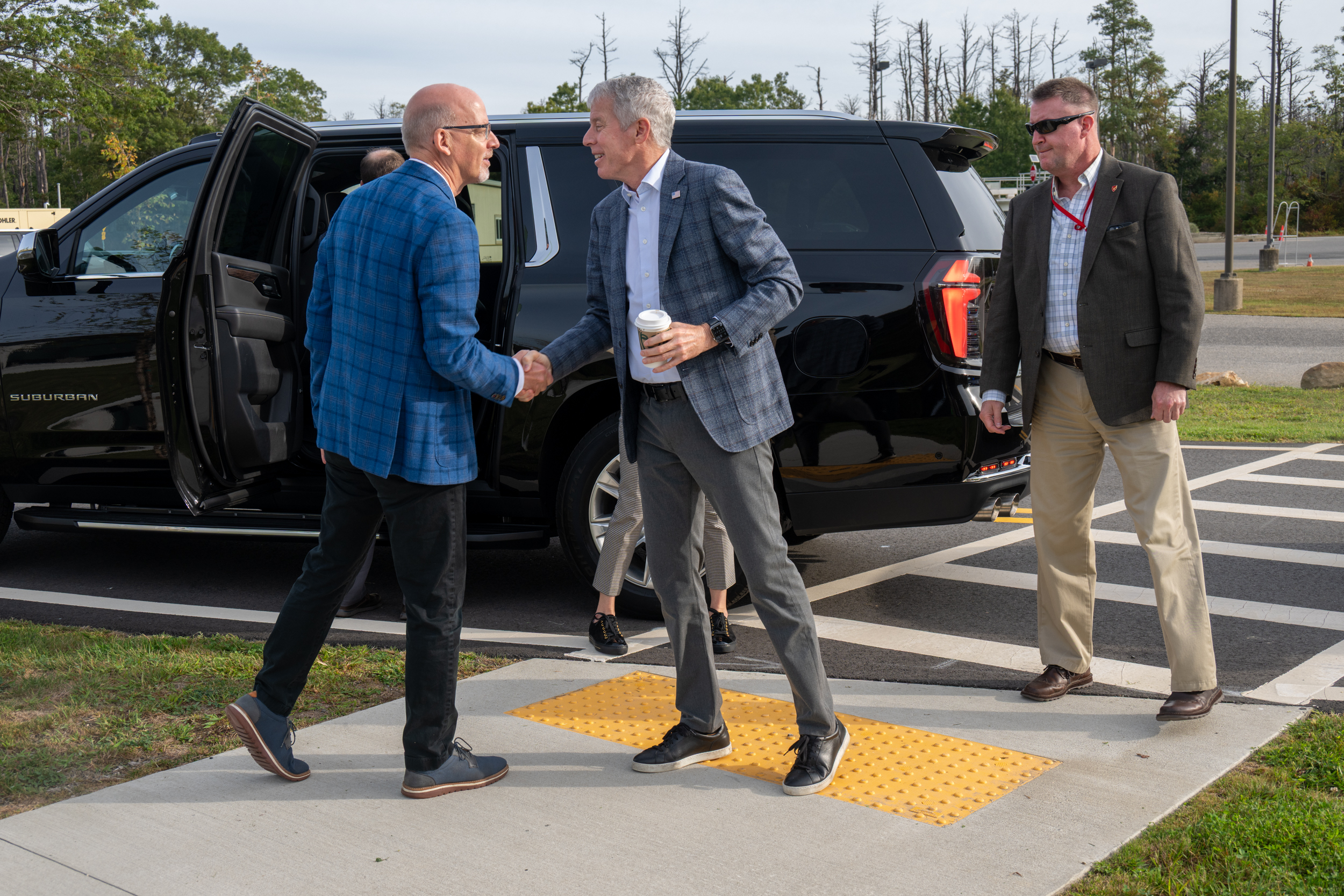 Brookhaven Lab Interim Director John Hill (left) welcomes Secretary Wright. (Kevin Coughlin/Brookhaven National Laboratory)