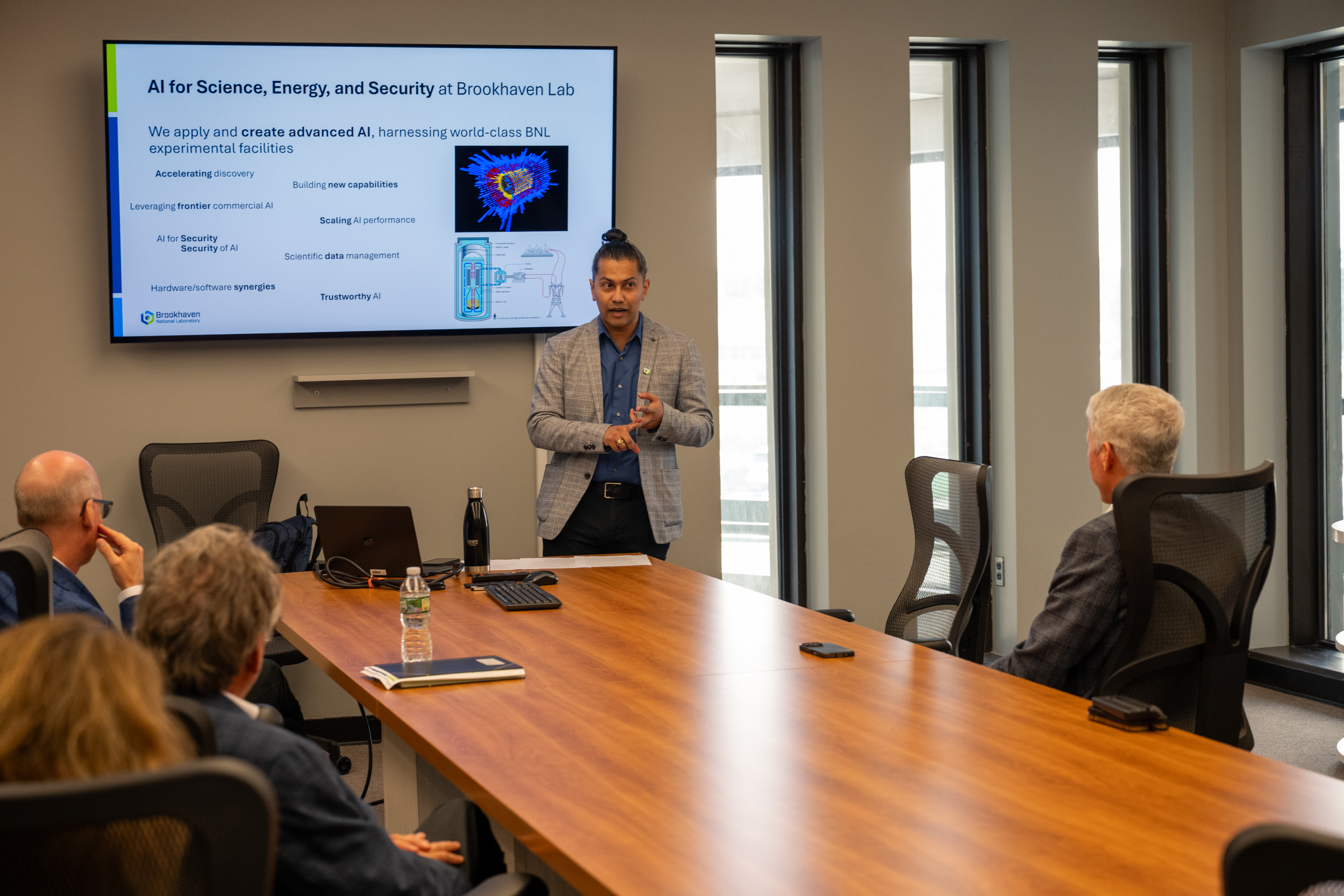 After a lunch with early career Lab staff — where the Secretary learned about their contributions to fields including accelerator physics, energy systems engineering, and isotope production — Wright visited the Lab’s Computing and Data Sciences directorate. He witnessed how state-of-the-art technologies compile one of the largest archives of scientific data in the world — over 500 petabytes, equivalent to 370 million Netflix movies — and provide remote access to that data for collaborators across the nation and around the world. He also learned about Brookhaven Lab’s efforts in “embodied AI,” in which robots powered by AI learn by interacting with the physical world — as opposed to learning from internet data — to become significantly more adept at controlling real-world systems. Brookhaven Lab is leading the way in using such embodied AI to advance its own science.