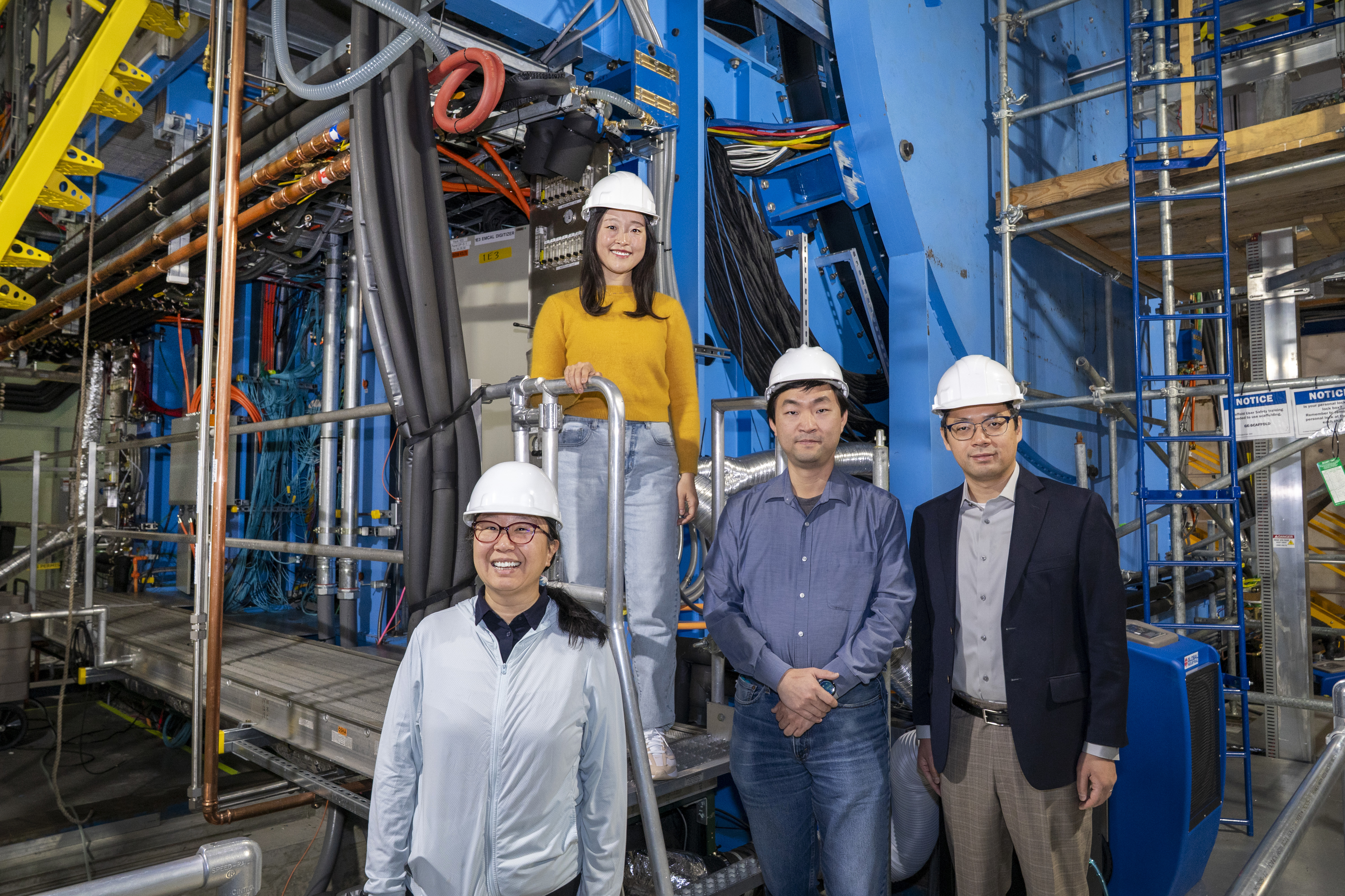 Yi Huang, Yeonju Go, Jin Huang, and Yihui (Ray) Ren stand at the sPHENIX detector of the Relativistic Heavy Ion Collider (RHIC) at Brookhaven National Laboratory. They are part of a team that developed an AI algorithm to compress sPHENIX data so more events can be recorded for future discoveries. (David Rahner/Brookhaven National Laboratory)