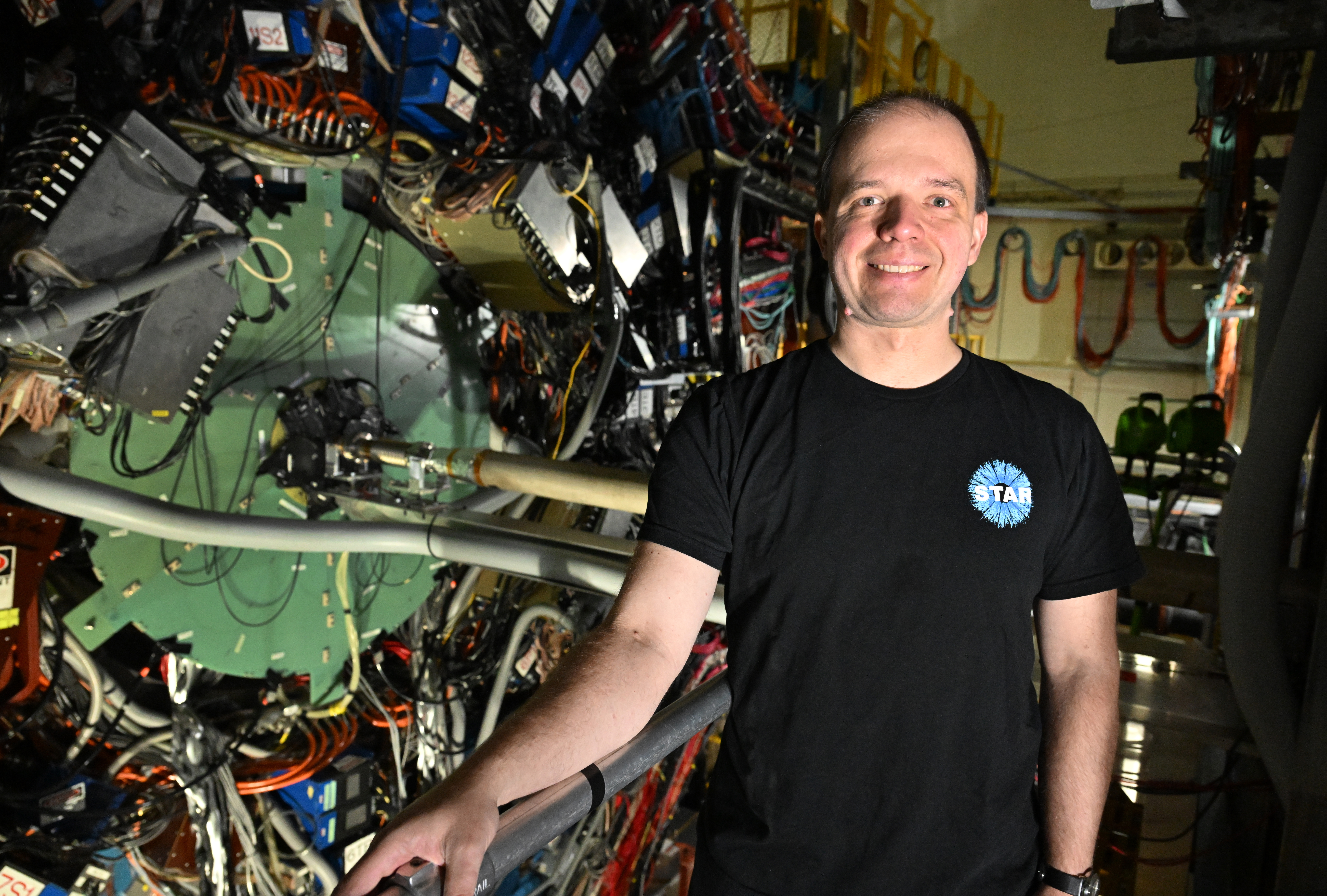 Jan Vanek, a physicist at the University of New Hampshire, stands in front of the STAR detector of the Relativistic Heavy Ion Collider (RHIC) at Brookhaven National Laboratory. Vanek led an analysis of data looking for spin correlations among lambda particles emerging from RHIC collisions while he was a postdoctoral fellow at Brookhaven. (Kevin Coughlin/Brookhaven National Laboratory)