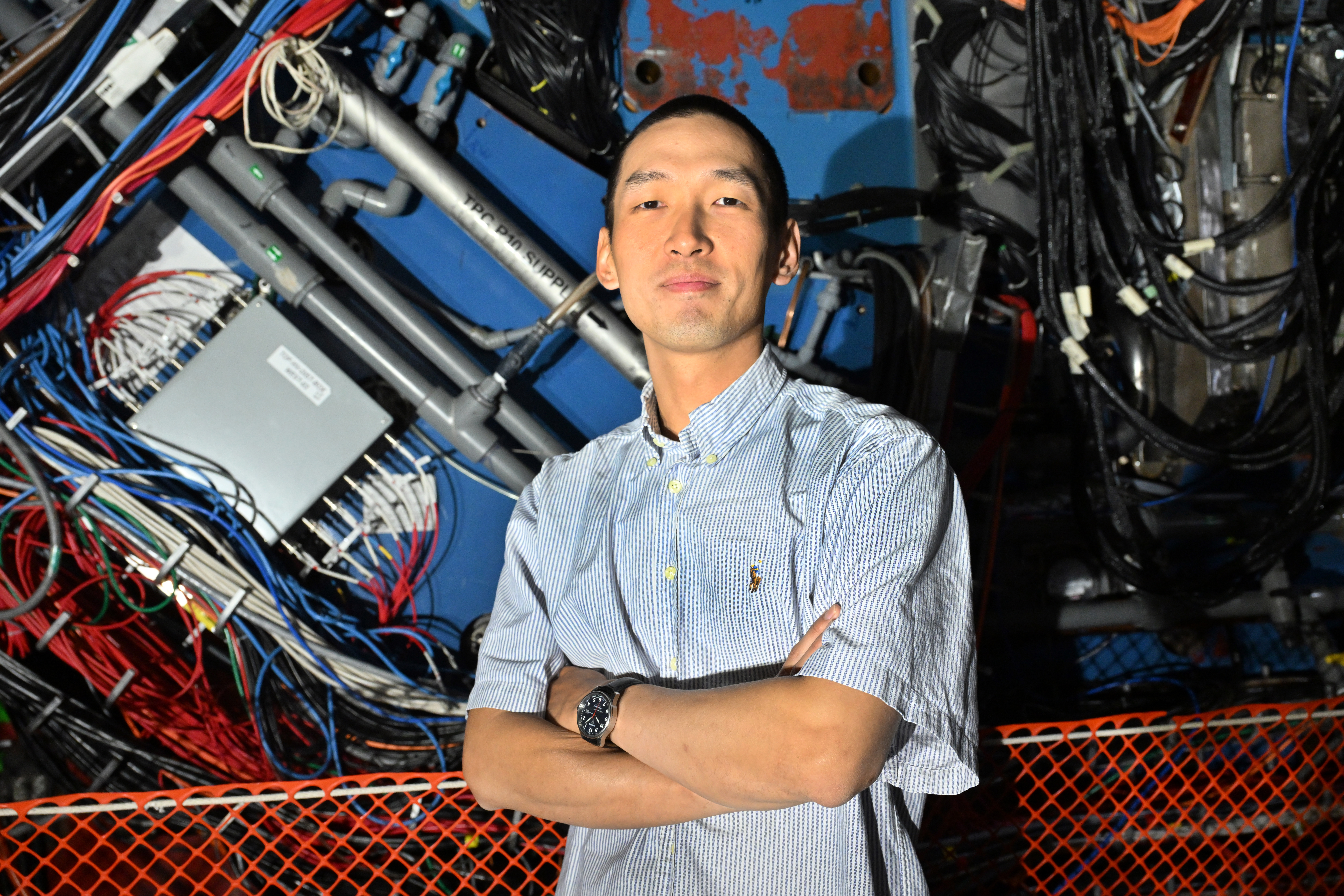 Brookhaven National Laboratory physicist Zhoudunming (Kong) Tu stands at the STAR detector of the Relativistic Heavy Ion Collider (RHIC) at Brookhaven National Laboratory. Tu led a study to explore how particles emerging from RHIC collisions could offer scientists a view into how visible matter emerges from the quantum vacuum. (Kevin Coughlin/Brookhaven National Laboratory)