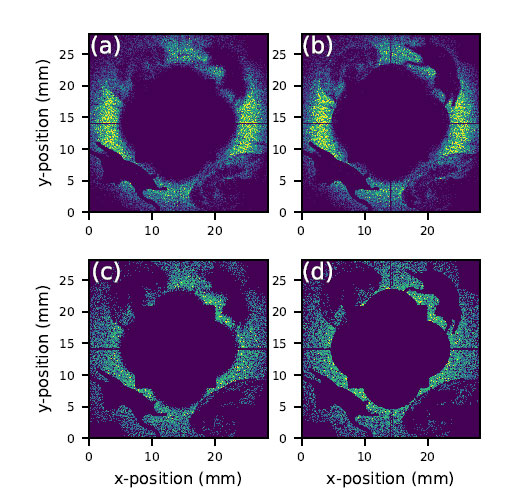 X-ray images showing how pairs of related X-ray signals line up, using both real measurements and computer models. (a) The original experimental image collected over 38 hours, before any adjustments were made. (b) The same image after researchers corrected the data to improve accuracy. (c) A computer-generated image that assumes the X-ray emission angles vary slightly around an average value. (d) A computer-generated image that assumes the X-ray emission angle stays perfectly constant. (Brookhaven National Laboratory)