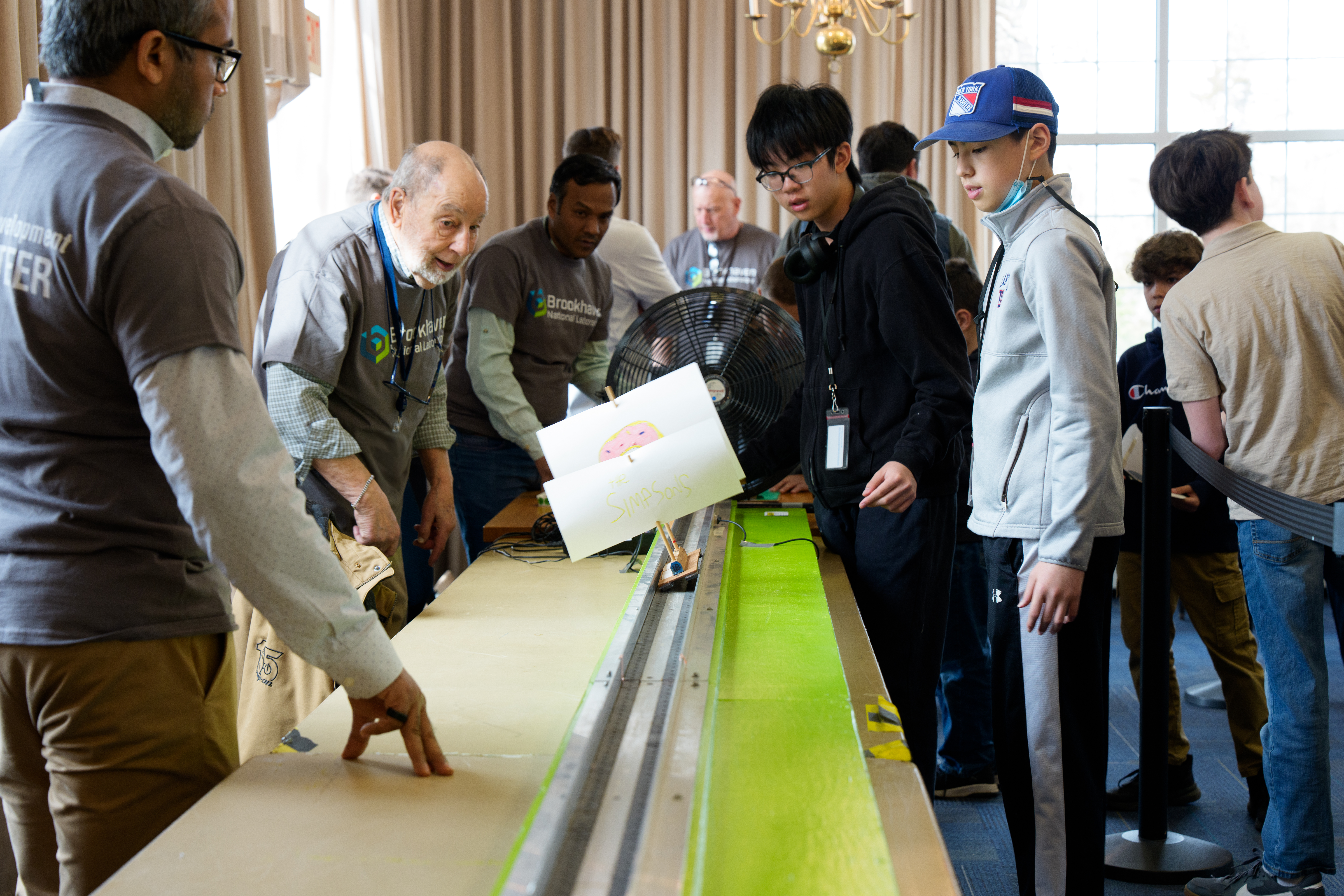 Volunteer judges watch with anticipation as a student releases his handmade Maglev vehicle for the wind power category during the Maglev Competition held at Brookhaven National Lab on March 26, 2026. (Timothy Kuhn/Brookhaven National Laboratory)