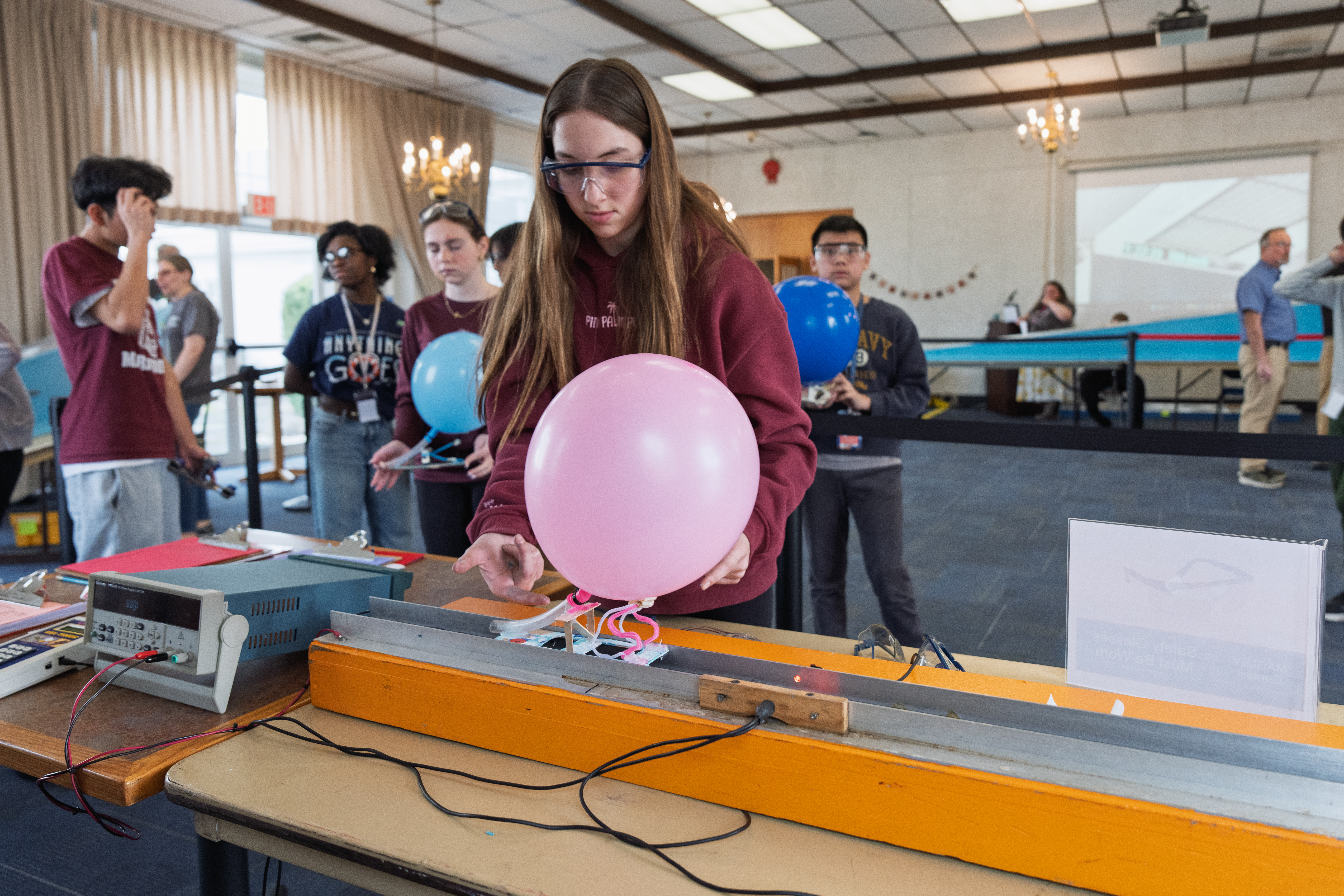 A student gently places her handmade Maglev vehicle, here affixed with a balloon, on a vertical magnet-lined track for the self-propelled category at the Maglev Competition. (Timothy Kuhn/Brookhaven National Laboratory)