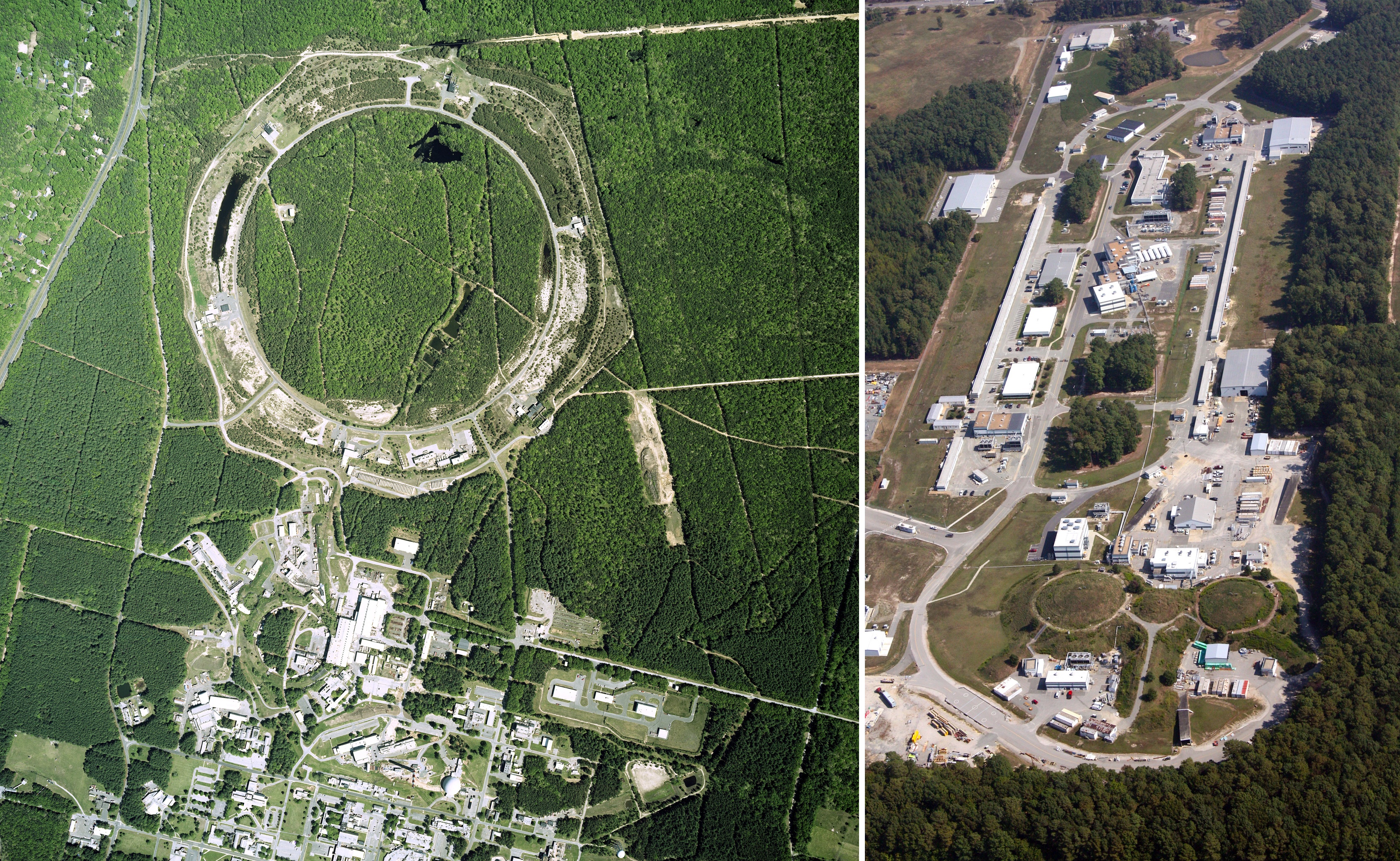 (left) The Relativistic Heavy Ion Collider at Brookhaven National Laboratory. (right) The Continuous Electron Beam Accelerator Facility at Thomas Jefferson National Accelerator Laboratory. Photo courtesy of Jefferson Laboratory.