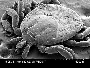 A scanning electron microscope (SEM) image of a tick that Gwen Wright pulled off herself one morning. The user Wright was training on the SEM at the time did not have his own sample to look at, so she used the tick sample instead.