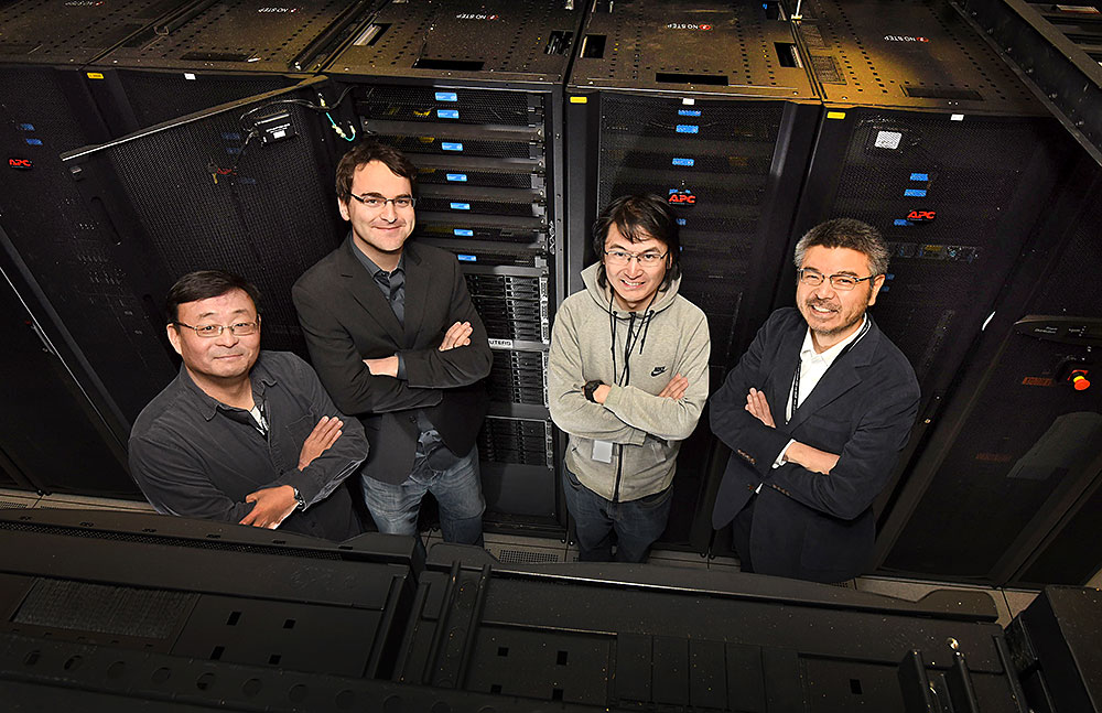 The QCD calculation team for Muon g-2 at Brookhaven Lab, from left: Chulwoo Jung (Brookhaven Lab), Christoph Lehner (University of Regensburg and Brookhaven Lab), Luchang Jin (University of Connecticut), and Taku Izubuchi (Brookhaven Lab and the RIKEN BNL Research Center). Many other theorists at Brookhaven and beyond are involved in the g-2 theory calculations.