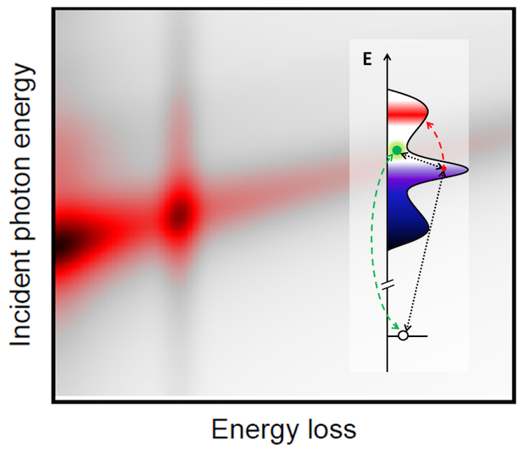 After a short time, the hole in the lower electron orbital is filled and X-ray light is remitted. The spectrum of this so-called inelastically-scattered radiation contains information about the induced electrodynamic processes, which in turn provides insights into the electronic structure of the material being studied.
