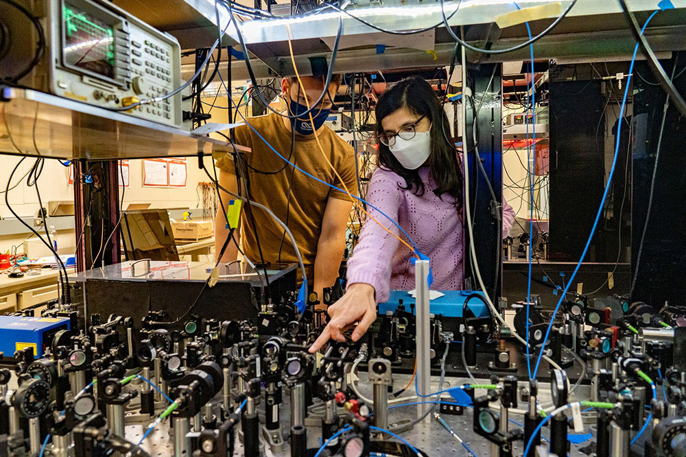 Members of the Figueroa Research Group in the Department of Physics and Astronomy's Figueroa Quantum Information Technology lab. (Photo by John Griffin)