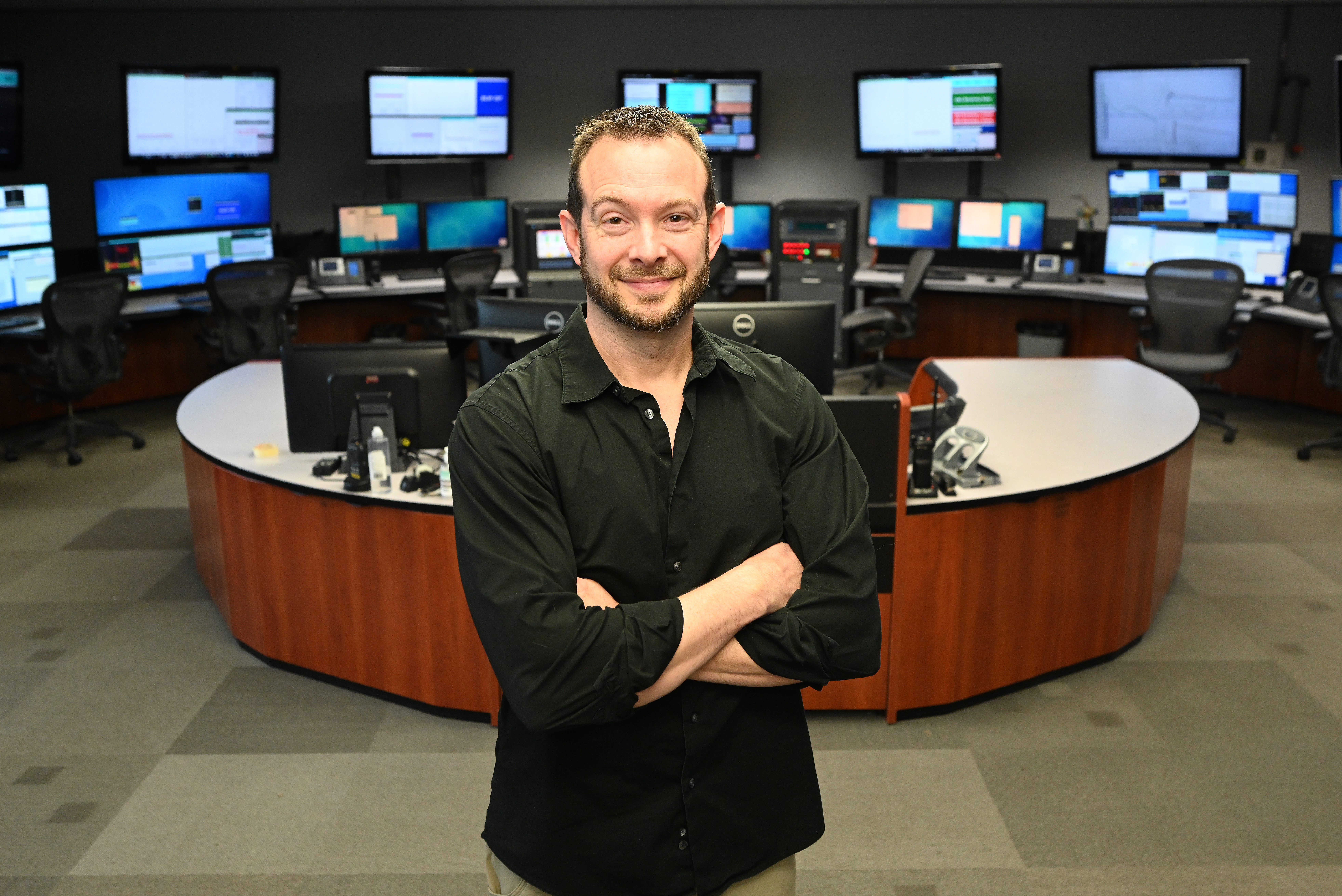 Travis Shrey, run coordinator for Run 23 at the Relativistic Heavy Ion Collider (RHIC), in the Main Control Room of the Collider-Accelerator Department at Brookhaven National Laboratory.