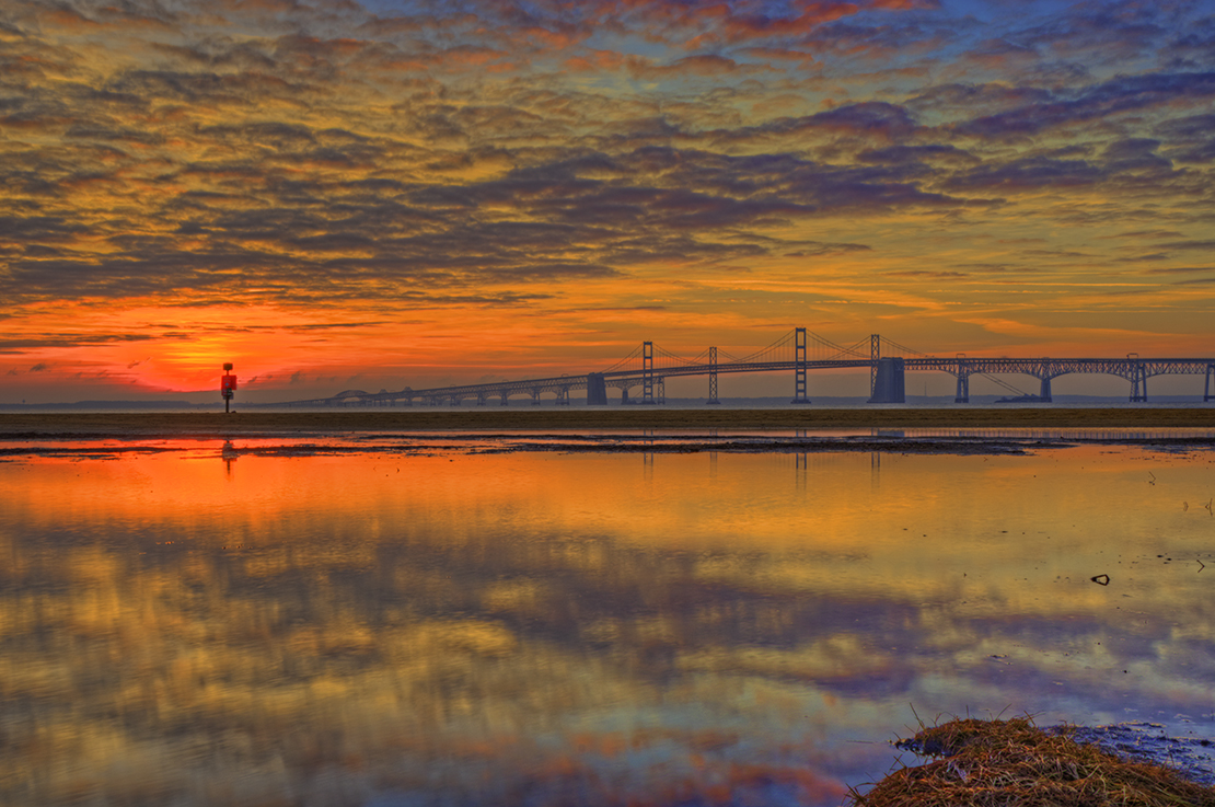 The Chesapeake Bay Bridge links Maryland's eastern and western shores. "Chesapeake Bay Bridge reflection sunrise" by Craig Fildes is licensed under CC BY-NC-ND 2.0.