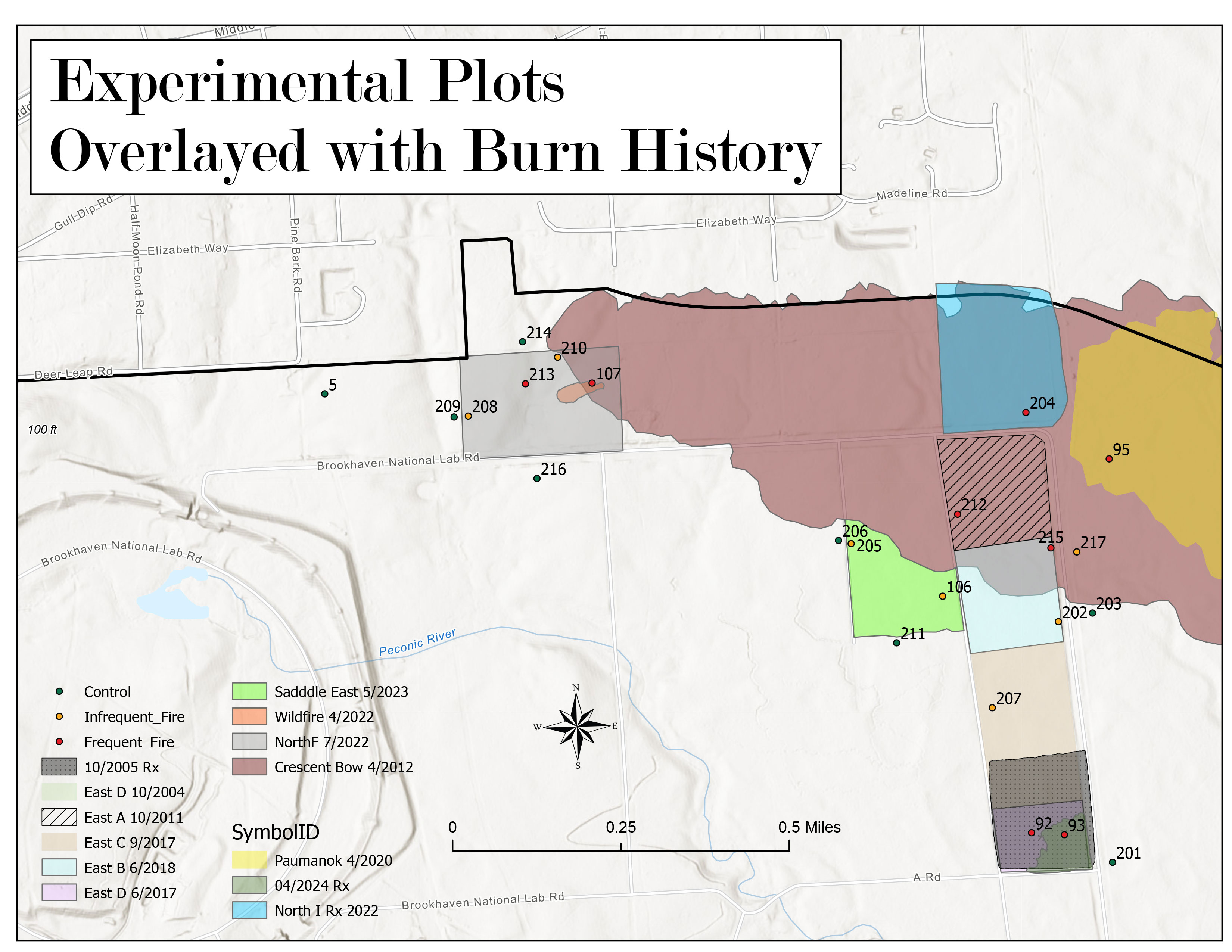 This map illustrates where the study's 23 plots are in relation to areas of previous fire. The experimental plots are marked with green, orange, or red dots depending on whether they are control/no-fire sites, infrequent-fire sites, or frequent-fire sites, respectively. The wildfires are denoted by amorphous shapes on the map, and the prescribed burns are identifiable as rectangles. The name and year of each fire, excluding the two most recent ones, are recorded in the legend. The bold, black line represents the border of Brookhaven's property. (Created by Gilvarg using Geographic Information System software and data courtesy of Prescribed Fire Program Manager Kathy Schwager)