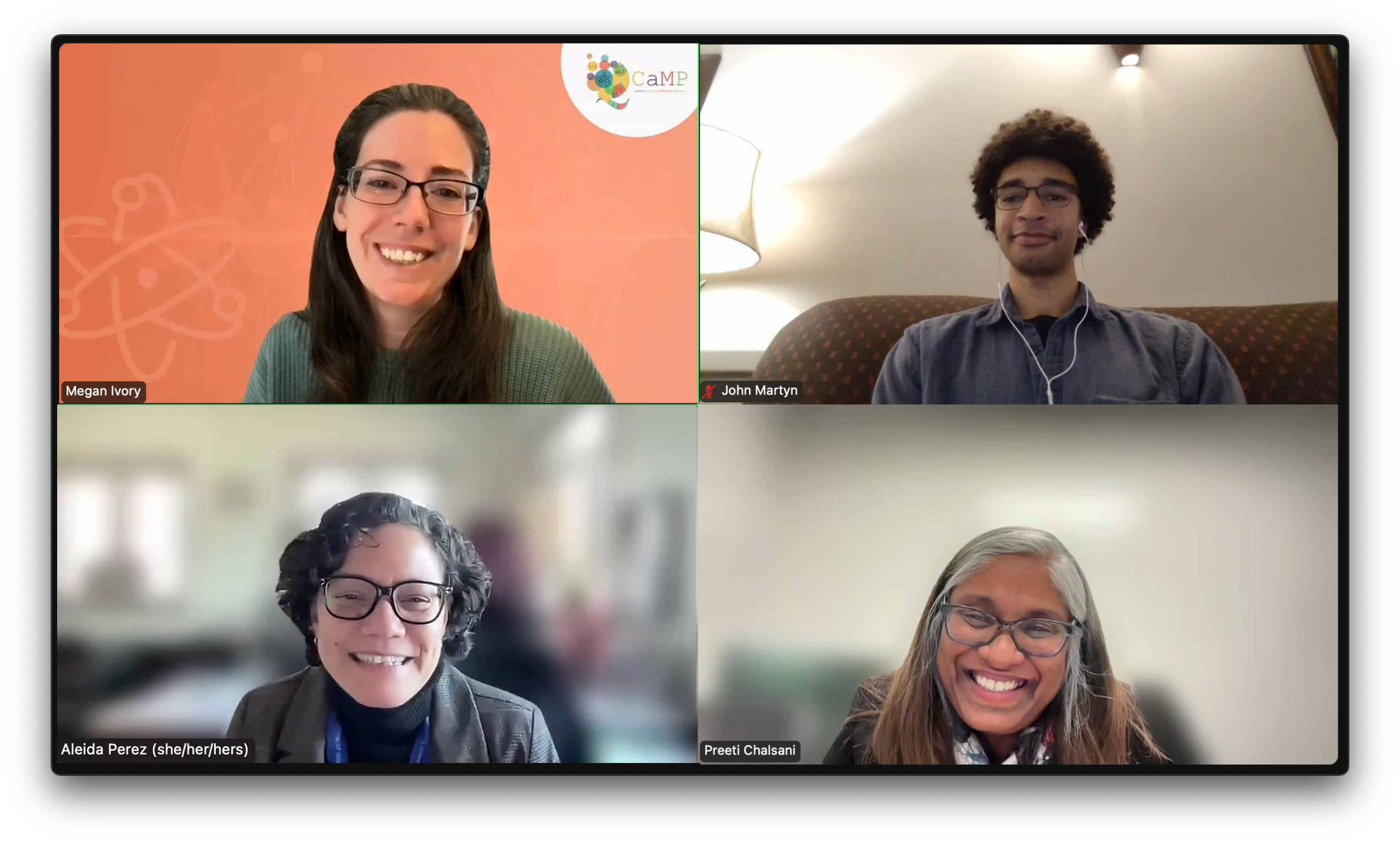 The "Building a Quantum ElectroDYNAMIC Workforce" panel was moderated by Megan Ivory. Clockwise from top left: Megan Ivory, Sandia National Laboratories; John Martyn, MIT; Preeti Chalsani, Intersect Illinois; Aleida Perez, Brookhaven National Laboratory.