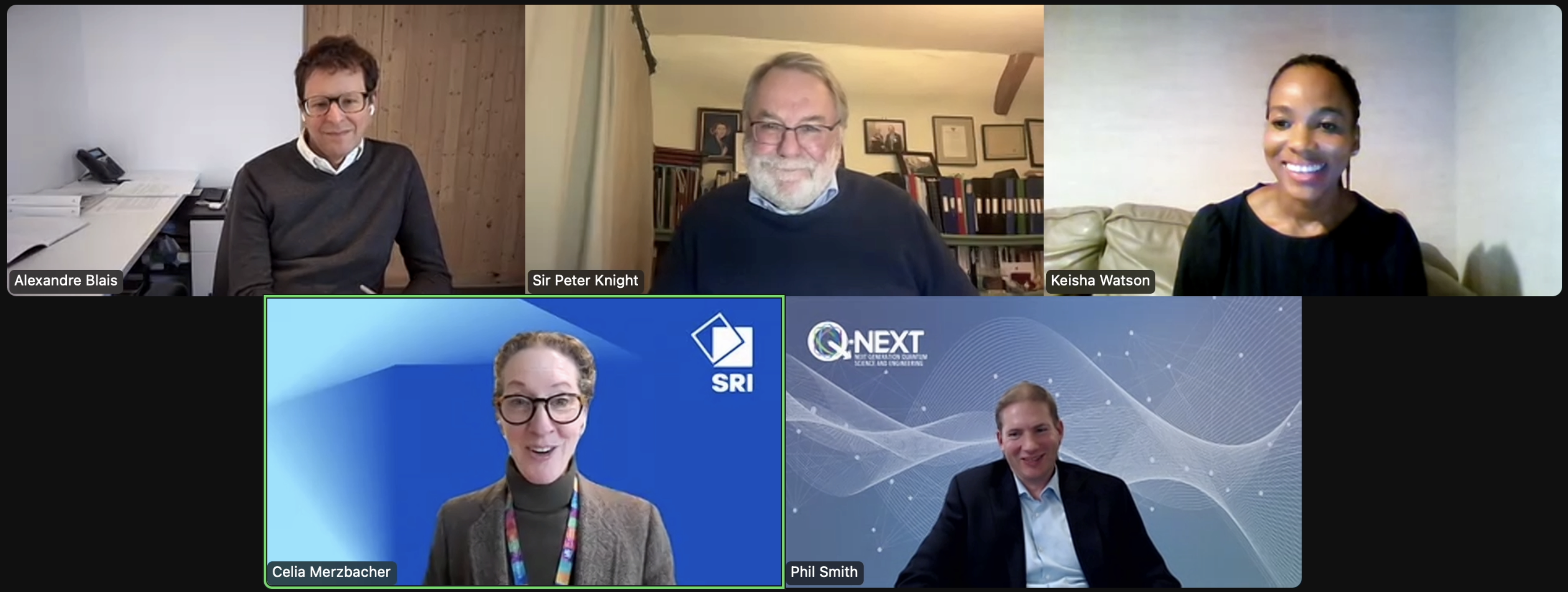The "Entangling Strategic Global Partnerships" panel was moderated by Celia Merzbacher. Clockwise from top left: Alexandre Blais, University of Sherbrooke; Sir Peter Knight, Imperial College London; Keisha Watson, Entangled Positions; Phil Smith, Argonne National Laboratory; Celia Merzbacher, QED-C.