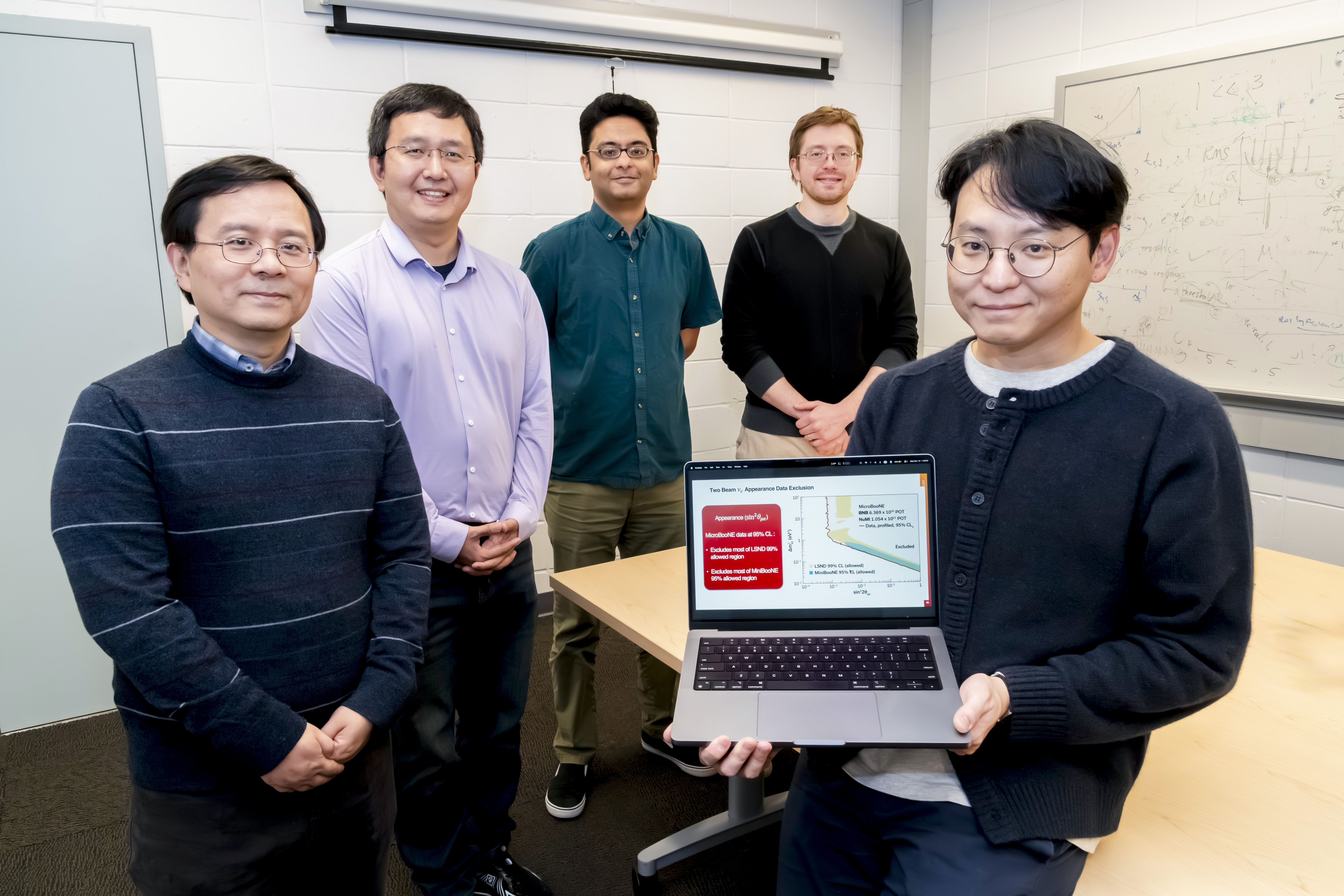 Brookhaven National Laboratory neutrino hunters Chao Zhang, Xin Qian, Bannanje Nitish Nayak, Sergey Martynenko, and Jay Hyun Jo display the latest result from the MicroBooNE experiment at Fermi National Accelerator Laboratory. The Brookhaven team led the development of the two-beam approach and the overall scientific analysis that enabled this result. (David Rahner/Brookhaven National Laboratory)