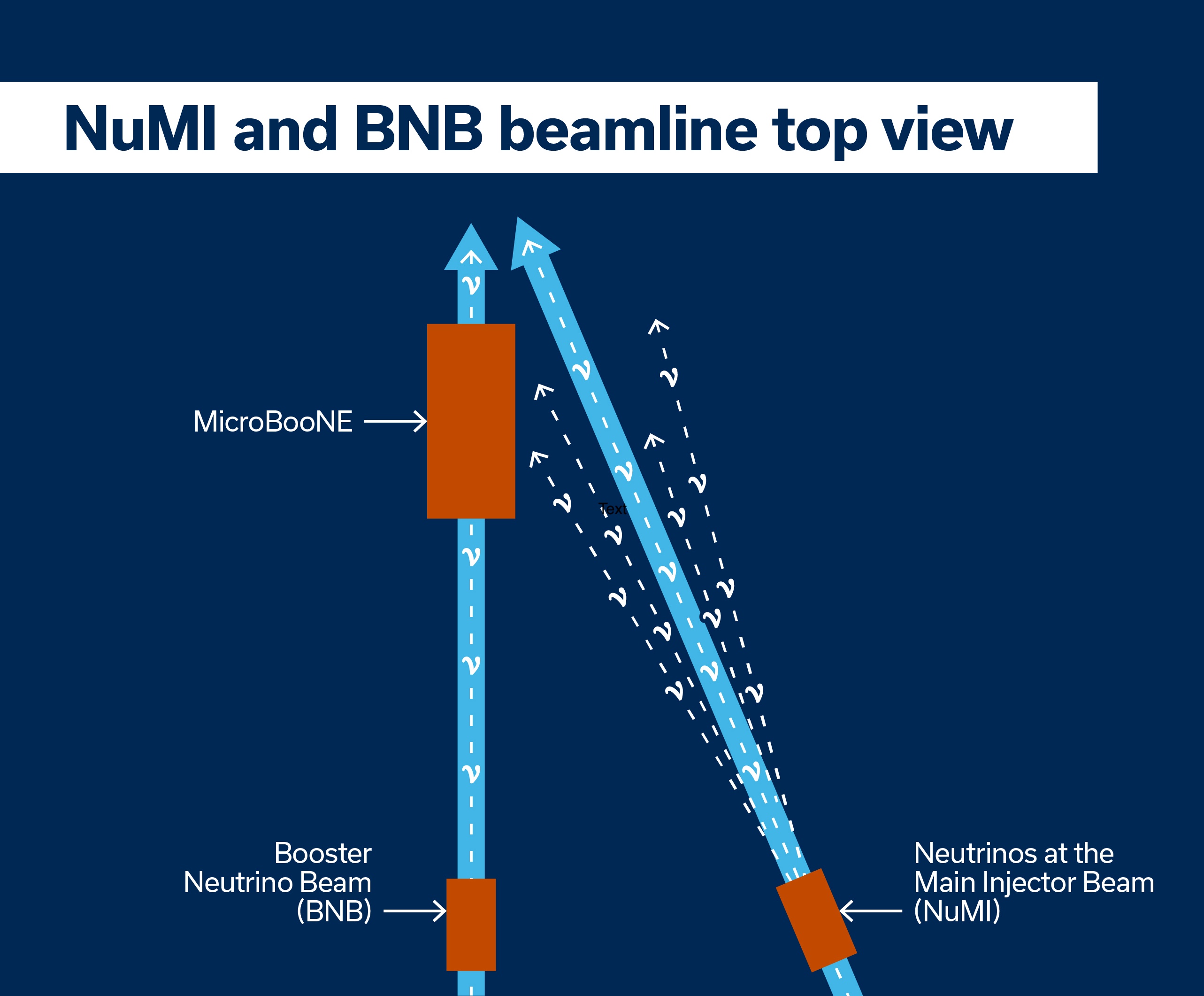 One detector, two beams: In addition to seeing neutrinos (ν) produced by Fermilab's Booster Neutrino Beam, the MicroBooNE detector also captures neutrinos from a slice of the NuMI beam as it travels to faraway targets such as the NOvA and MINOS experiments. By comparing how neutrinos from these two beams interact in the same detector, scientists have sharpened their ability to rule out potential hiding places for sterile neutrinos. (Samantha Koch/Fermi National Accelerator Laboratory)