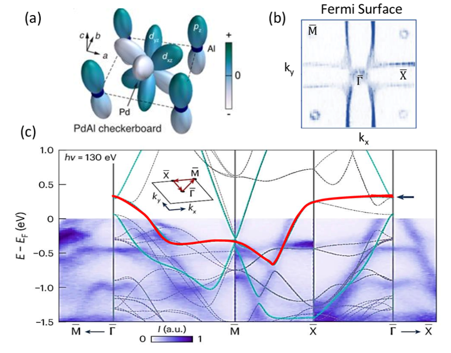 a) Orbital orientation of PdAl layer in Pd5AlI2 forms a checkerboard lattice. (b & c) ARPES Fermi surface map and band structure (blue) along the path (inset; red) of the surface BZ. DFT calculated band structure is overlaid on top (dashed grey) with bands linked to the decorated checkerboard model highlighted in cyan and red.