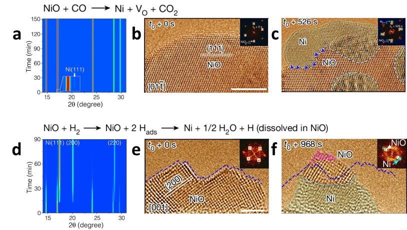 (a) In-situ synchrotron X-ray diffraction (XRD) measurements of NiO reduction under CO flow. A weak Ni(111) reflection appears early (inset), indicating rapid nucleation of metallic Ni, but its intensity remains low over time — suggesting self-limiting surface reduction. (b, c) Time-resolved HRTEM images showing NiO reduction at 400°C under CO pressures of approximately 1 Pa. (d) Time-resolved XRD during NiO reduction under H2 shows an initial incubation period, followed by rapid and sustained growth of Ni(111), (200), and (220) reflections, consistent with bulk phase transformation to metallic Ni. (e, f) In situ HRTEM images showing NiO reduction at 400°C under H2 pressures of approximately approximately 0.08 Pa.