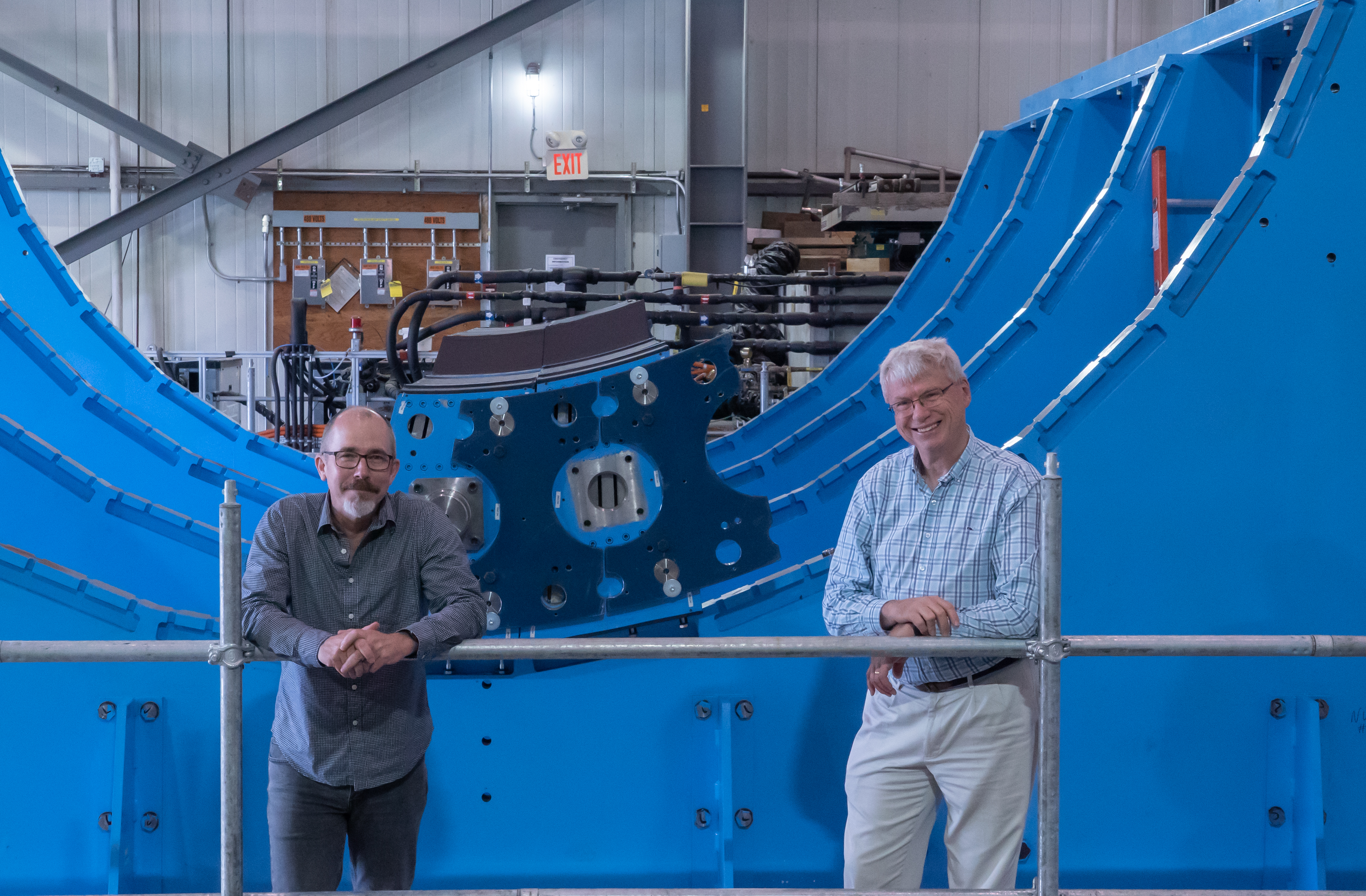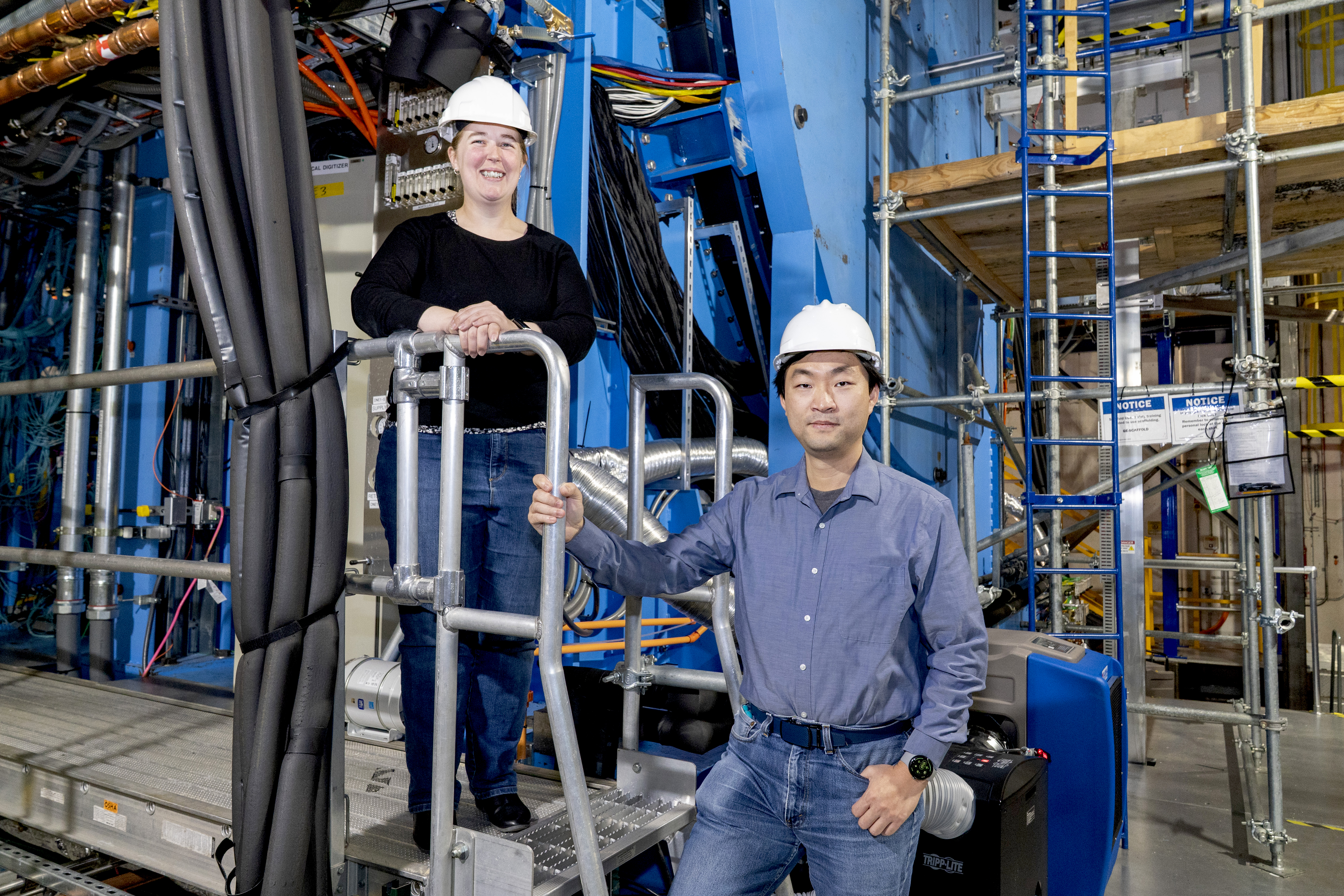 Megan Connors and Jin Huang at the sPHENIX detector, 2025. (David Rahner/Brookhaven National Laboratory)