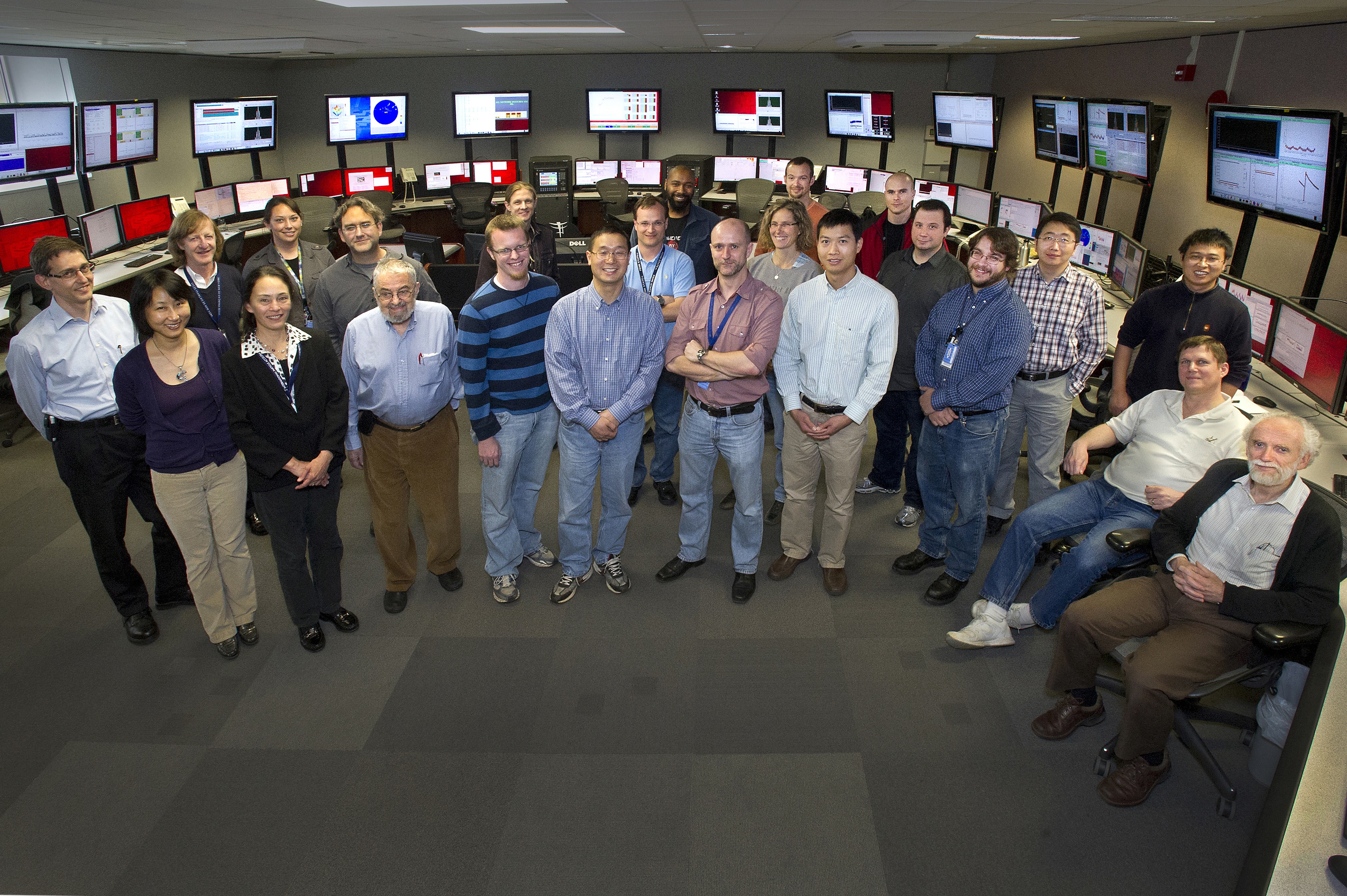 Photo above: Some of the Collider-Accelerator Department team who worked on Run 12 at the Relativistic Heavy Ion Collider are: (front, from left) Mei Bai, Michiko Minty, Ernest Courant, Vincent Schoeffer (Polarized Proton Run Coordinator), Yun Luo (Heavy Ion Run Coordinator), Christoph Montag, Chuyu Liu, Kevin Mernick (stochastic cooling), Mike Blaskiewicz (stochastic cooling, sitting), and Mike Brennan (stochastic cooling, sitting); (second row, from left) Wolfram Fischer, Francois Meot, Tasha Summers, Vahid Ranjbar, Brian Van Kuik, Gregory Marr, Will Jackson, Angela Drees, Travis Shrey, Jordan Ziegler, Guillaume Robert-Demolaize, Yue Hao, and Xiaofeng Gu.