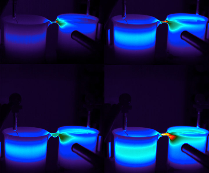 Infrared thermal images of the floating water bridge setup at the Advanced Photon Source at Argonne National Laboratory. The color scale goes from 24°C (dark purple) to 50°C (bright yellow). The four quadrants show the water bridges with different thicknesses and temperatures. The bottom left image shows a water bridge immediately before collapse, due to reduced voltage.