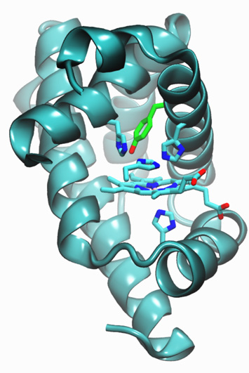 Ribbon diagram showing introduction of histadine and tyrosine residues into myoglobin, resulting in enzymes that reduce oxygen (O2)to water (H2O) with more than 1,000 turnovers and minimal release of reactive oxygen species