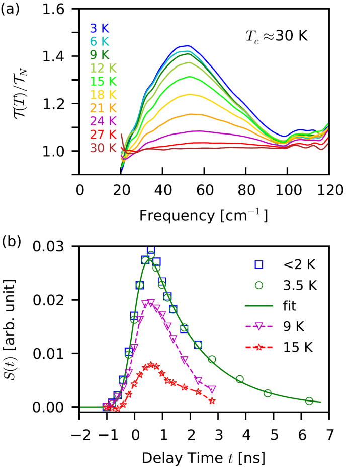 (a) Data taken from 3 to 30K showing the temperature dependence of infrared transmission through the LaFeAsO1-â€xFx thin film, normalized to the transmission at 33K (b) Time-â€resolved infrared transmission data through the sample from about 2K to 15K. The slow (ns) relaxation time indicates the presence of a full superconducting gap.