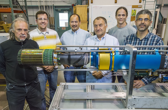 Berkeley Lab's Heavy Flavor Tracker team included (from left) Mario Cepeda, Kenneth Wilson, Leo Greiner, Howard Wieman, Thomas Johnson and Giacomo Contin. (Photo by Roy Kaltschmidt)