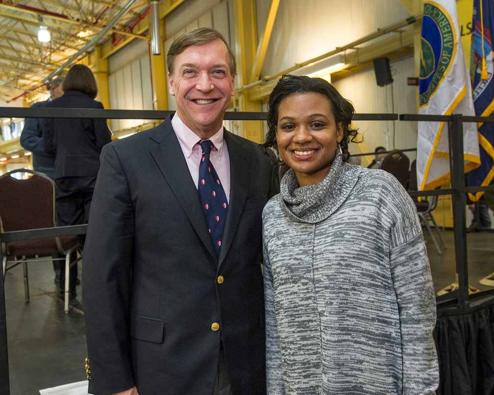 Stony Brook University President and Chair of Brookhaven Science Associates Samuel L. Stanley Jr., and Stony Brook University student Melissa Sims celebrate the opening of Brookhaven's newest facility at the NSLS-II Dedication Ceremony.