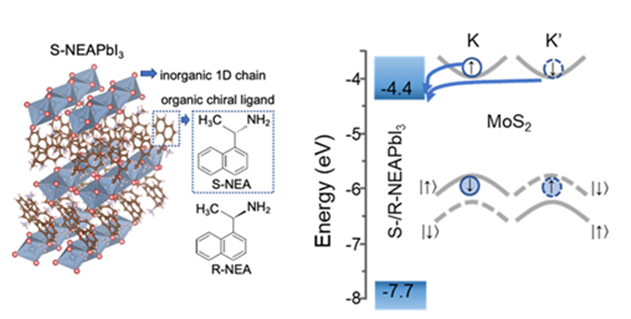 Figure caption: Heterostructure composed of a chiral one-dimensional perovskite and a monolayer TMD (left), and the corresponding band alignment favoring spin-selective charge transfer from the TMD to the chiral perovskite (right). Reproduced from Nature Communications 14, 5234 (2023).
