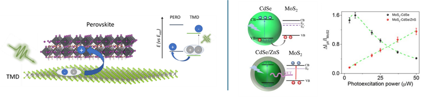 Figure caption: (Left) Perovskite–monolayer TMD heterostructure exhibiting interfacial charge transfer, with band alignment favoring hole transfer from the TMD to the perovskite. (Right) Bandgap engineering of quantum dot–TMD heterostructures enabling selective charge or energy transfer. Adapted from ACS Advanced Optical Materials (2023).